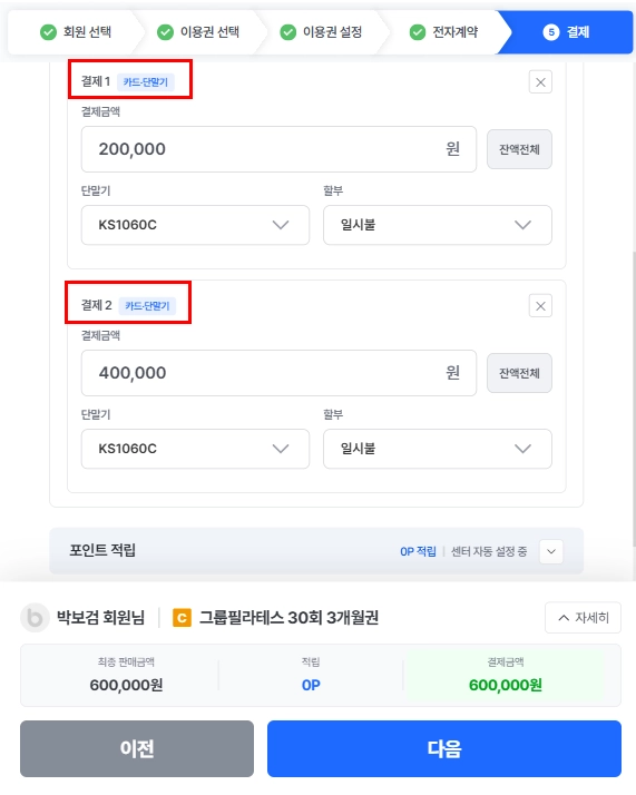 3) 결제 원하는 일부 금액 입력한 뒤, 다시 카드를 선택하여 나머지 금액을 기입해주세요.