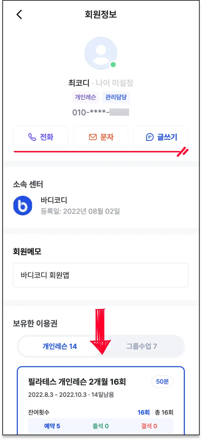 최코디 회원은 개인레슨 이용권을 구매하였고, 관리담당자가 강사님이라 개인레슨, 관리담당에 모두 보여집니다.