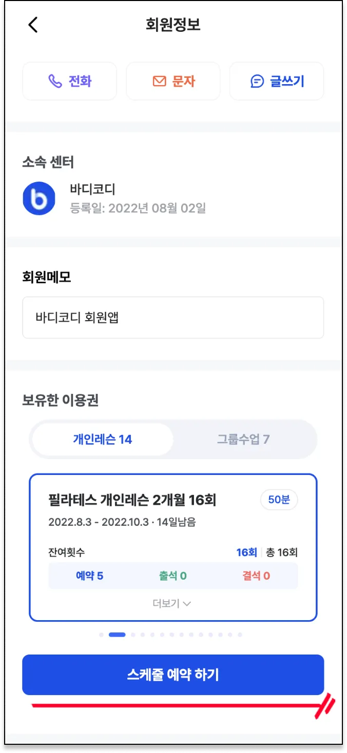 전화, 문자 버튼을 누르면 회원에게 전화와 문자를 할 수 있습니다.