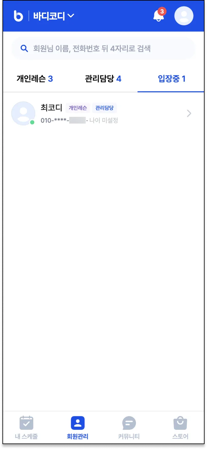 초록색 불이 들어오고, 입장중 탭에서 입장한 회원을 확인할 수 있습니다. 담당 회원이 센터에 왔다는 사실을 놓칠 수 없겠죠?