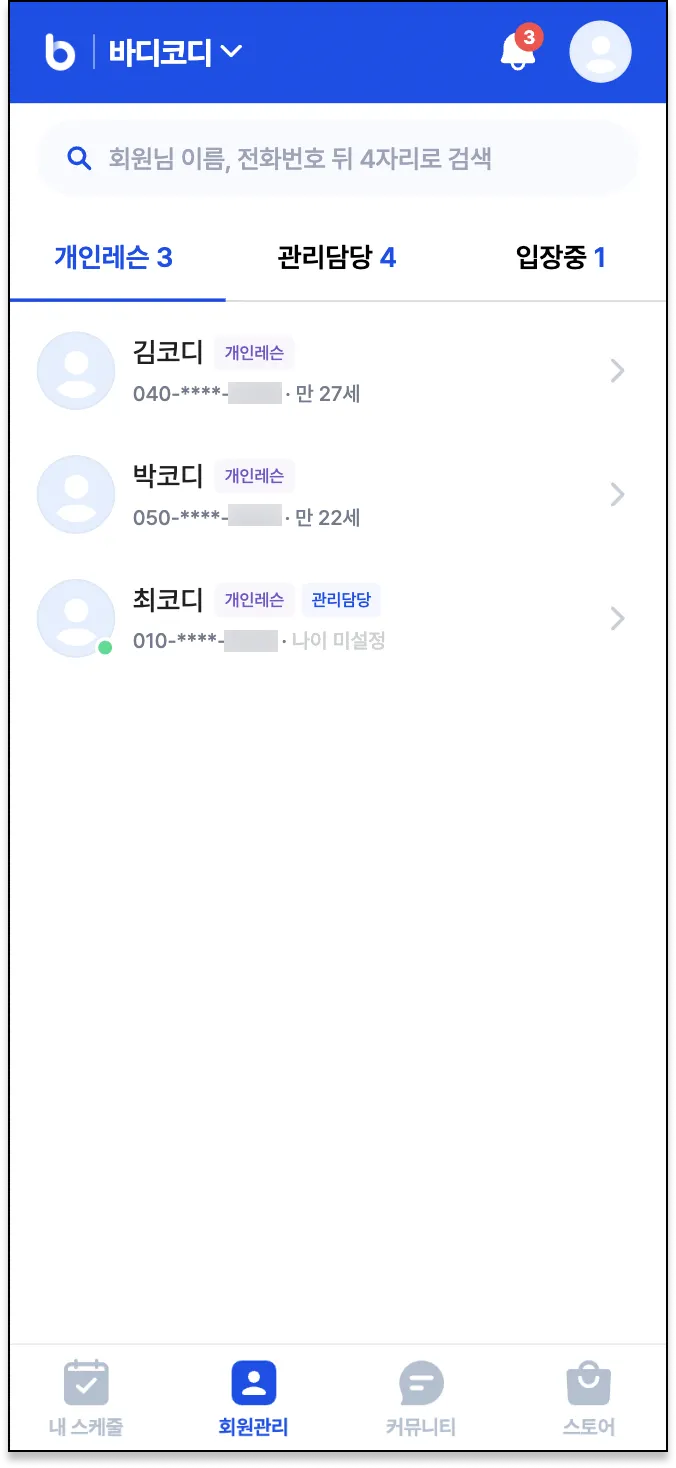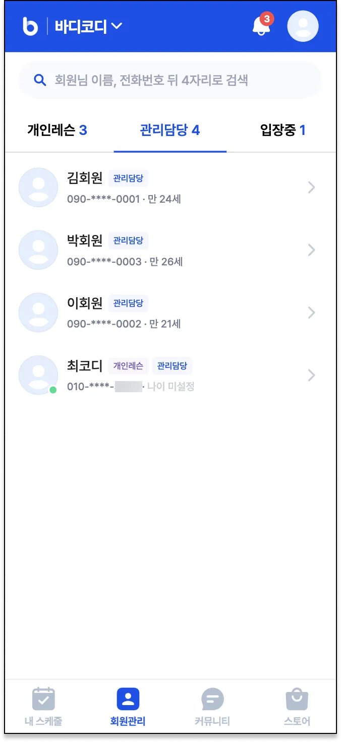‘회원관리’메뉴에서 관리할 수 있는 회원은 개인레슨 회원과 관리담당 회원입니다.