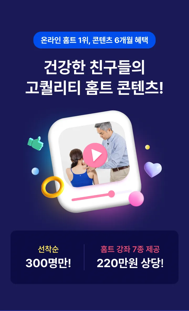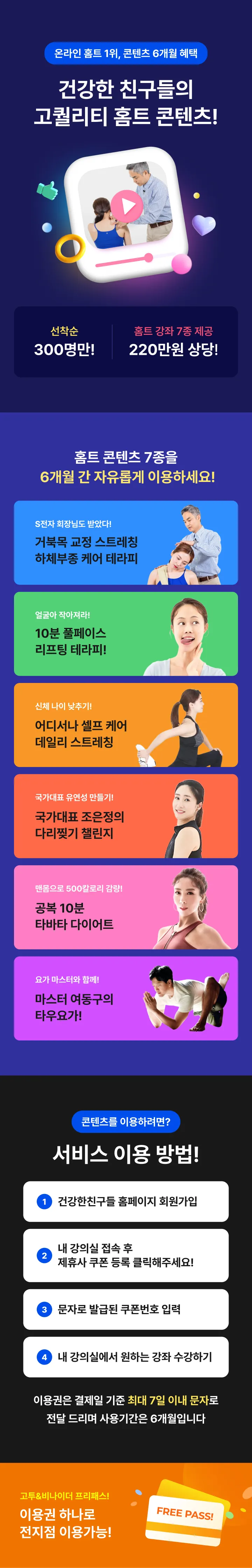 200만원 상당 대한민국 1위 온라인 피트니스 콘텐츠 건친(건강한친구들) 홈트 콘텐츠를 6개월간 무상 으로 이용할 수 있는 상품입니다.