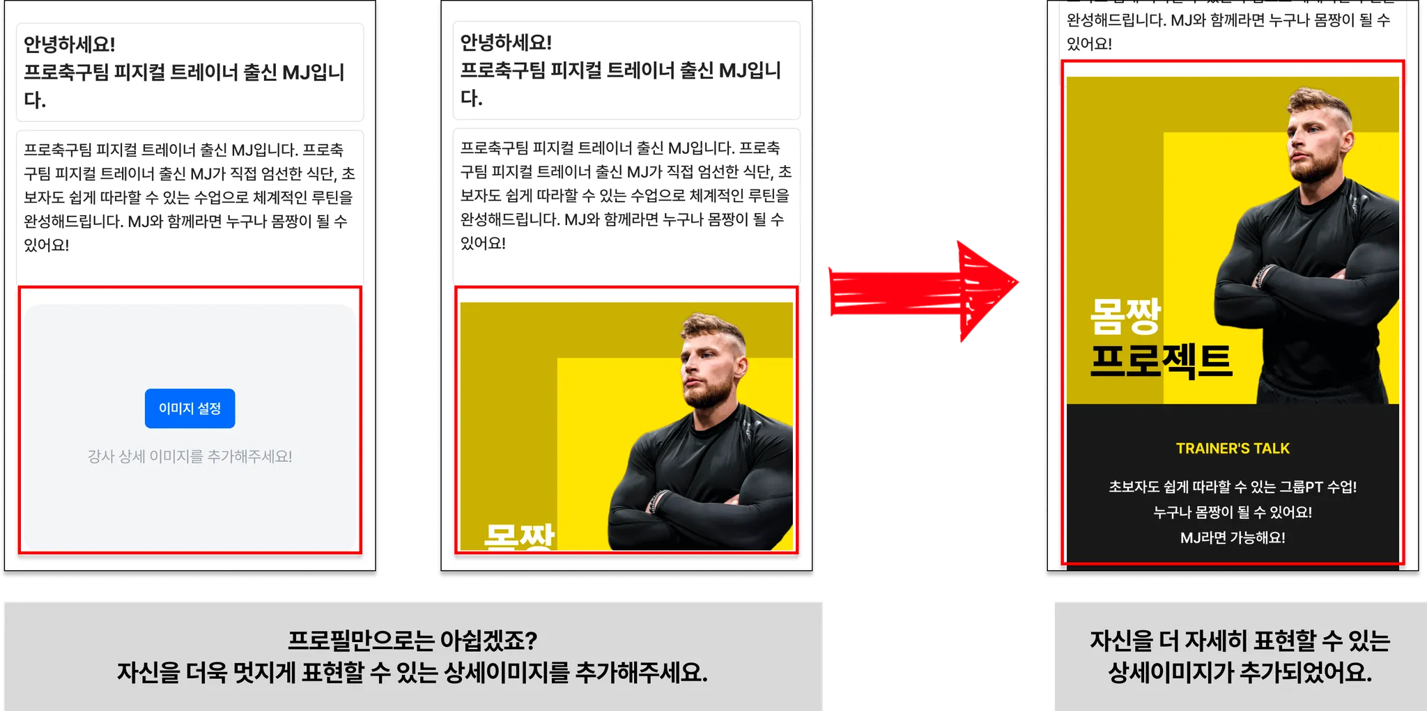 인사말로는 나를 소개하긴 아쉬워요! 그렇다면, 나를 더욱 자세히 소개해줄 수 있는 상세이미지를 추가해보세요.