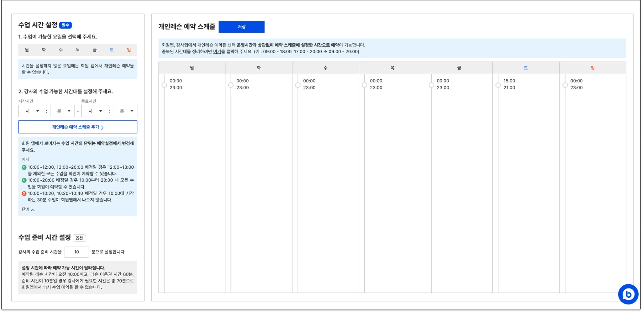 강사의 개인레슨 예약 가능한 시간대 설정은