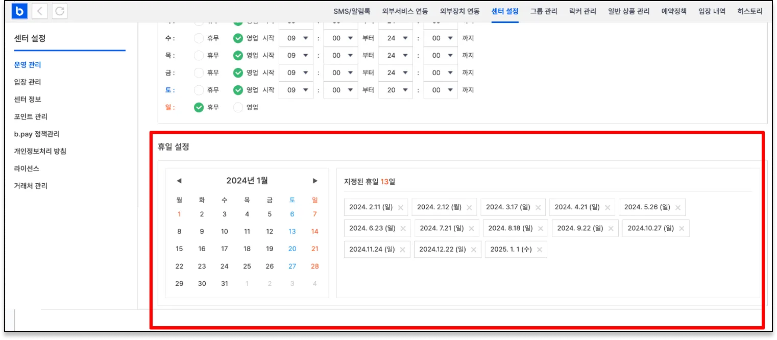 바로 요기서 센터 휴일설정을 해 주세요!