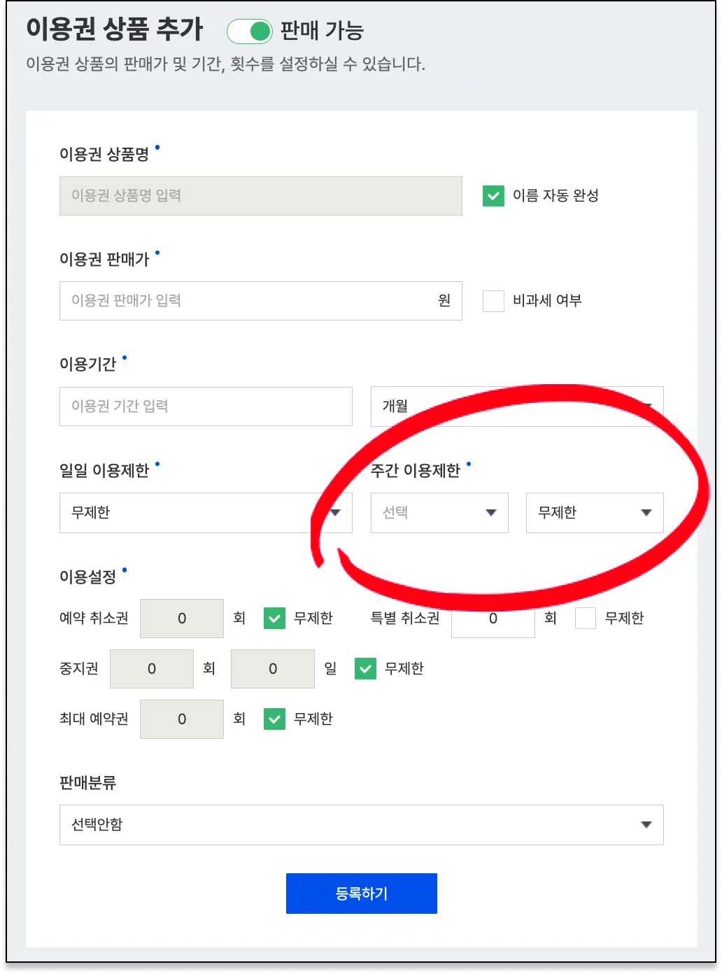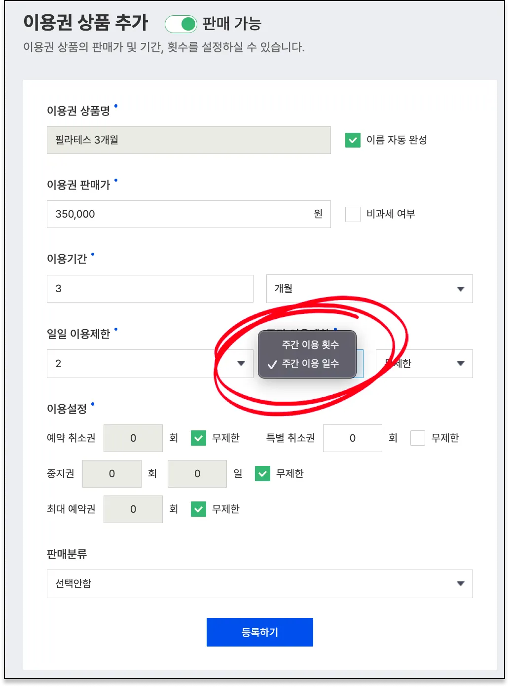 1. 이용권을 생성 화면이에요. 주간 이용제한을 선택할 수 있는 메뉴가 추가되었어요.