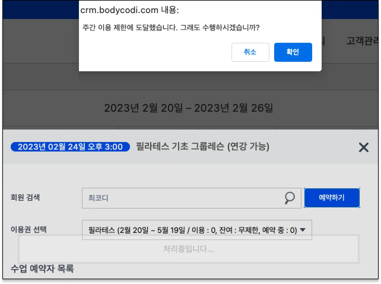 회원의 이용권이 주간이용일수를 초과했더라도, CRM과 강사앱에서는 예약을 할 수 있어요.