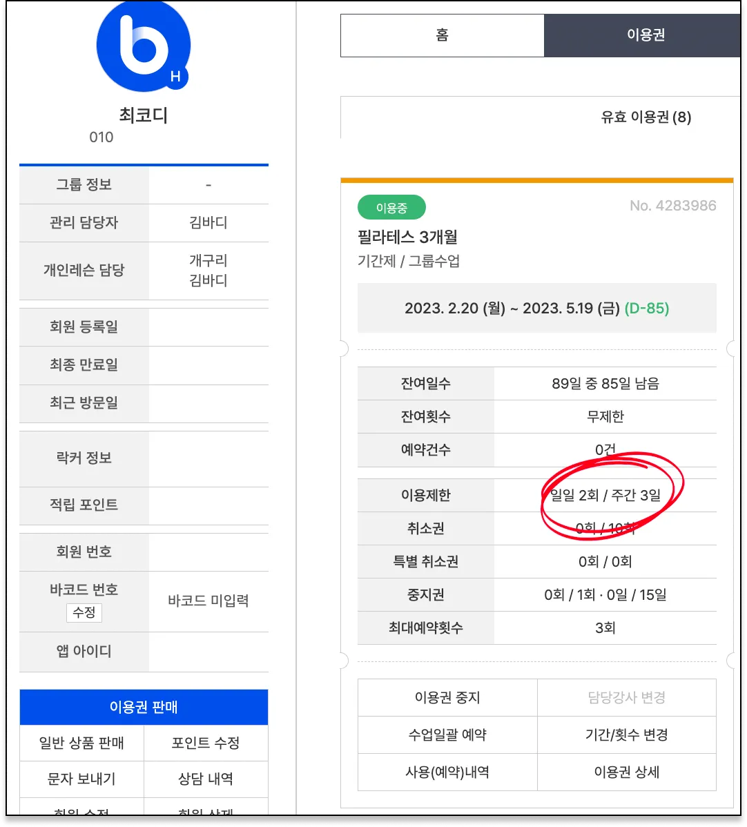 최코디 회원은 주간이용일수를 3회로 설정한 이용권을 이용하고 있어요.