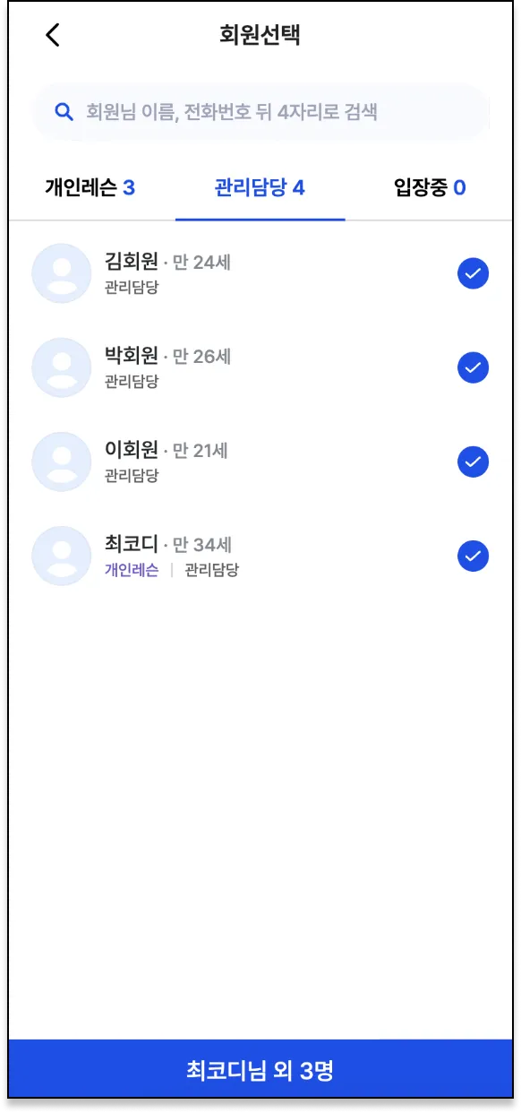 ‘바디스크린'을 통해 체형 분석을 공유할 회원을 선택해 주세요. (저는 여기서 관리 담당 회원을 선택할게요!)