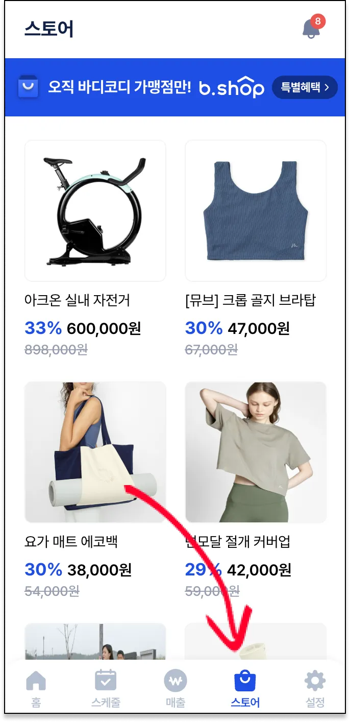 강사앱 메뉴의 ‘스토어’에서 b.shop을 만날 수 있어요.