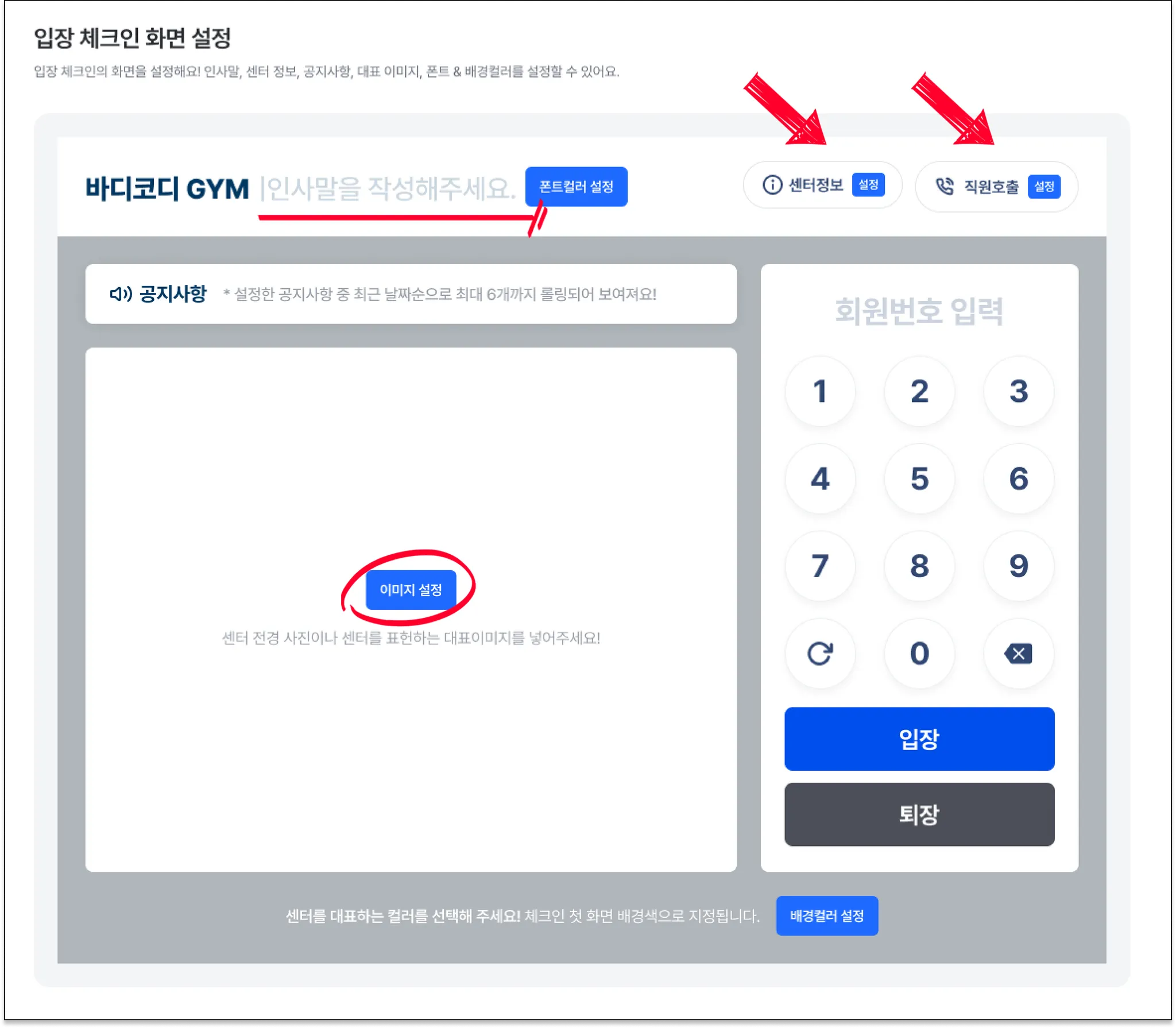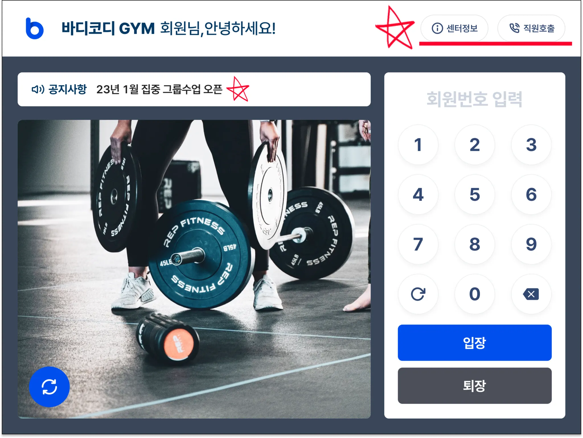 센터정보와 공지사항을 체크인화면에서 확인할 수 있고, 직원 호출도 할 수 있어요!