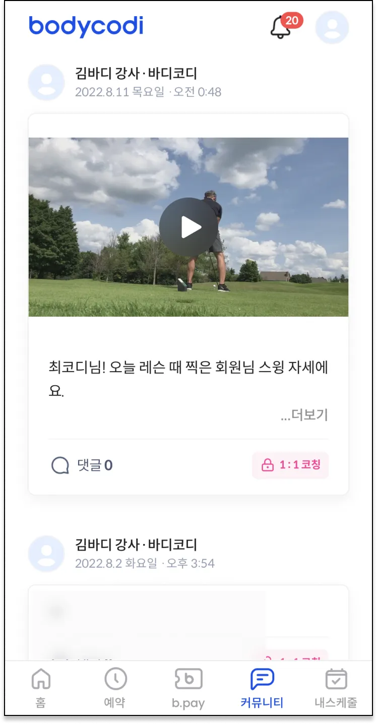 바디코디 강사앱의 커뮤니티 기능 두번째. ‘동영상 첨부 기능'을 활용하면, 시간과 장소에 구애받지 않고 회원의 자세나 운동하는 모습 등을 회원과 공유할 수 있어요.