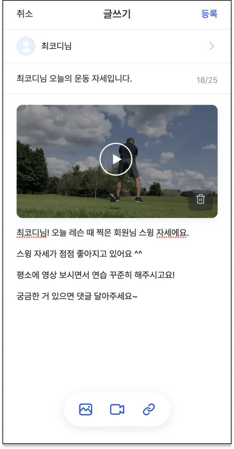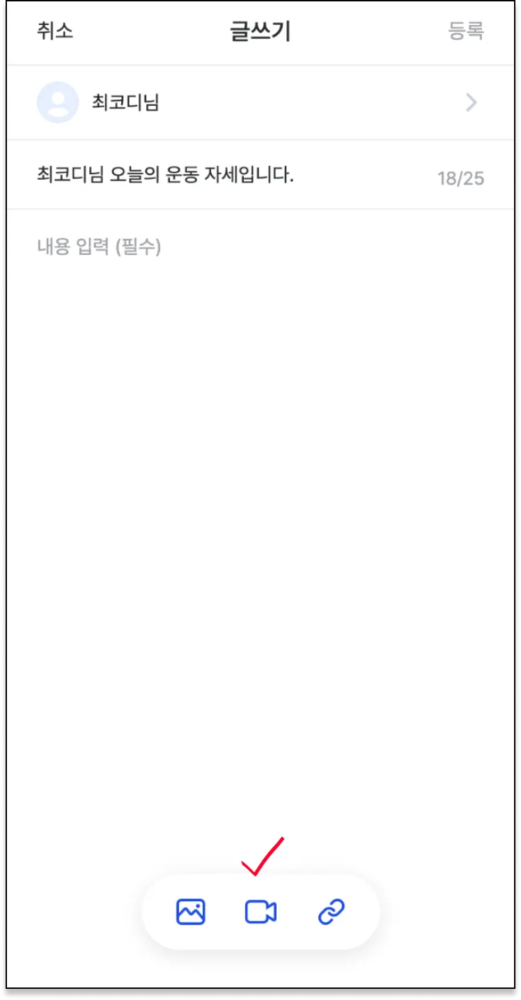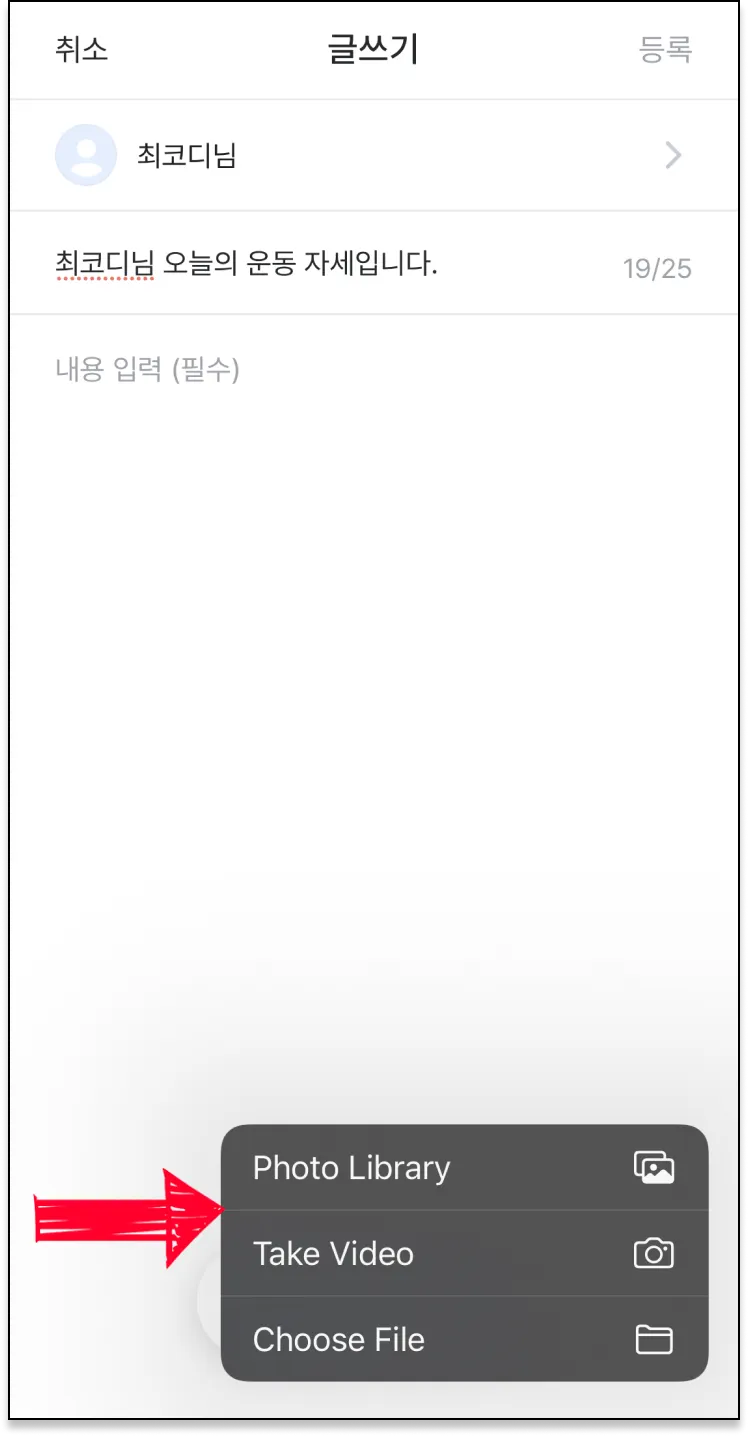 실시간으로 강사앱에서 영상을 촬영하거나, 강사의 스마트폰에 저장한 영상을 게시글에 첨부하여 공유할 수 있는 기능입니다.