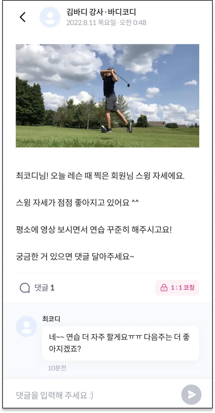 )회원이 게시글에 댓글을 달면, 강사앱으로 푸시 알림이 와서 회원 케어를 놓칠 수가 없다는 점!