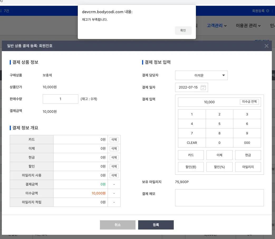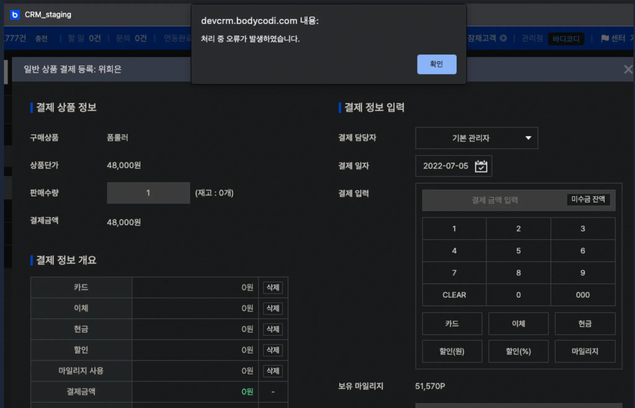 일반 상품 판매 중, 재고가 0인 상품이 있을 경우 ‘처리 중 오류가 발생하였습니다’ 메시지가 출력되어 혼란을 줄 수 있기에 해당 문구를 아래와 같이 수정 하였습니다.