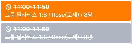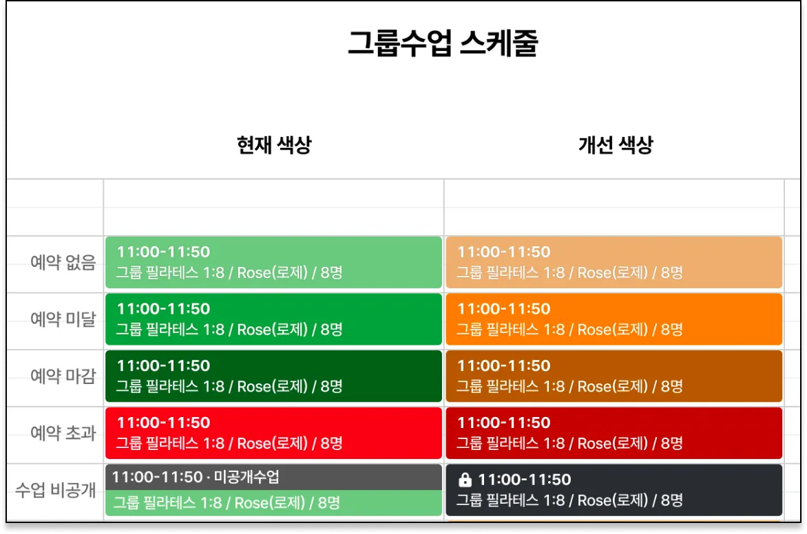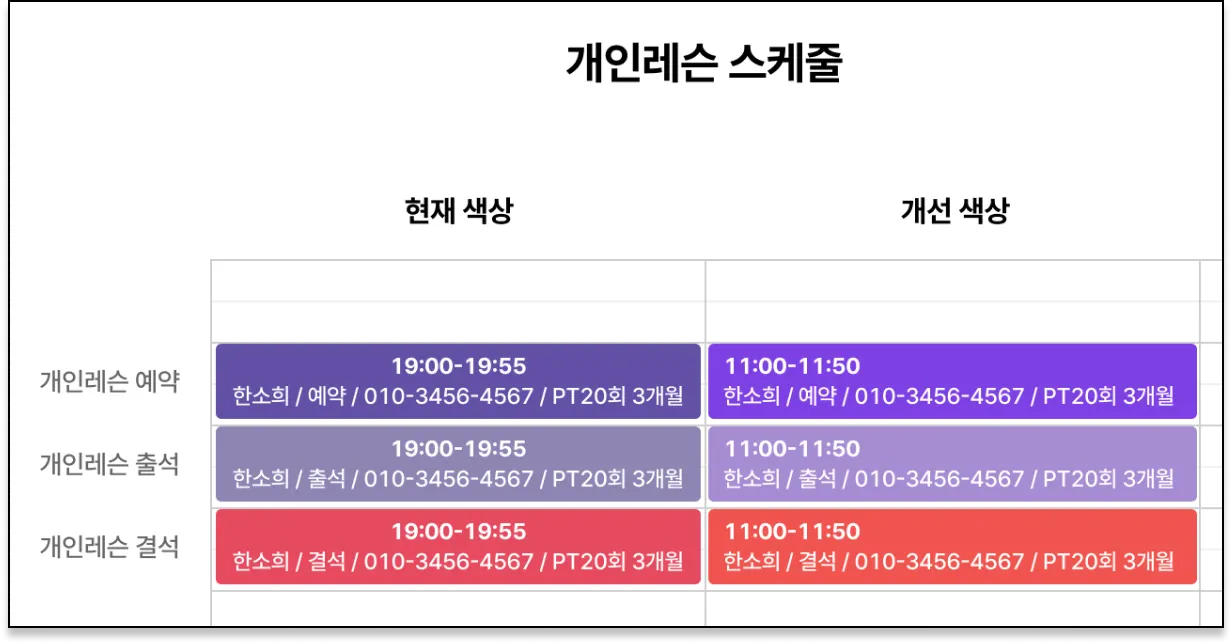 스케줄카드와 이용권의 색상을 통일하여 CRM-강사앱-관리자앱에서 스케줄 확인을 헷갈리지 않고 명확하게 할 수 있게 변경됩니다.