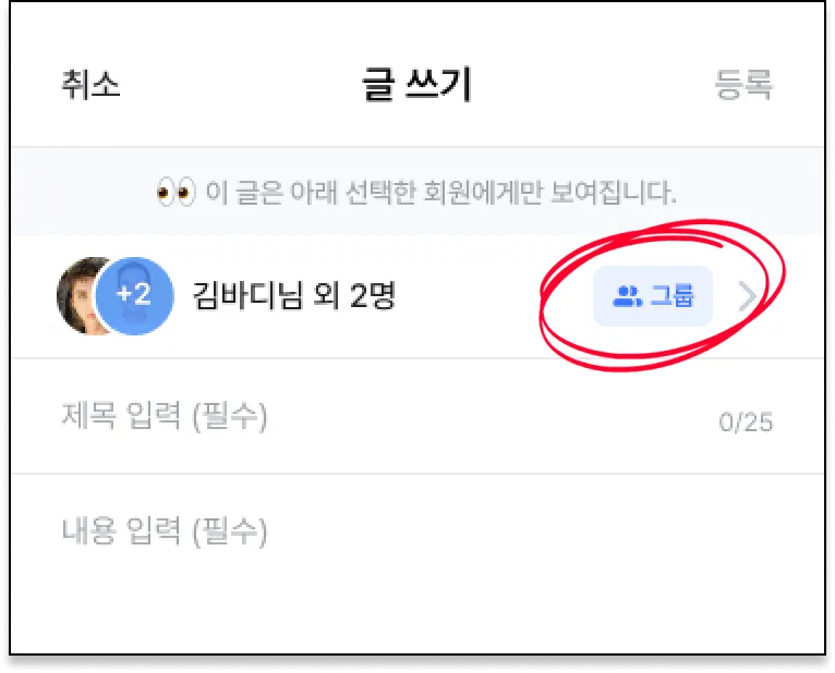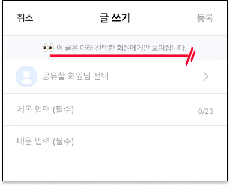 커뮤니티에서 글 쓰기를 눌렀을 때, 선택한 회원에게만 보여진다는 문구가 추가되었어요.