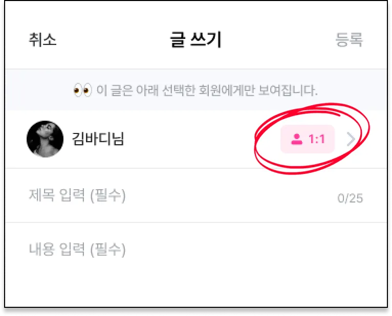 게시글을 작성할 때, 이 글이 1:1로 보내는지, 누구에게 보내는지 명확하게 구분하기 어려워 보다 쉽게 알아볼 수 있도록 표현 방식을 개선했어요.