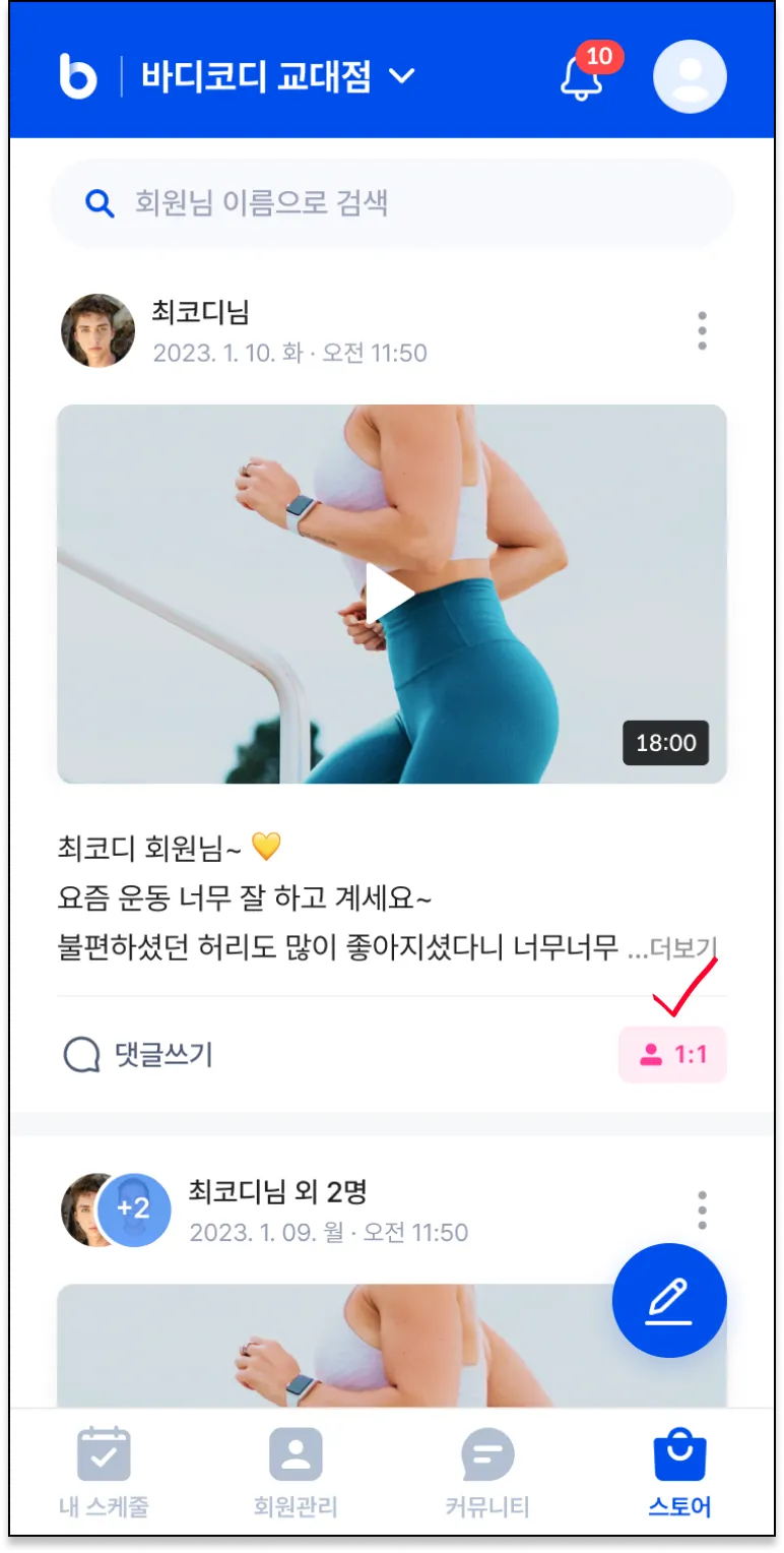 바디코디 강사앱은 커뮤니티에서 체형분석, 영상 공유 등 회원과 게시글로 서로 소통할 수 있어요.