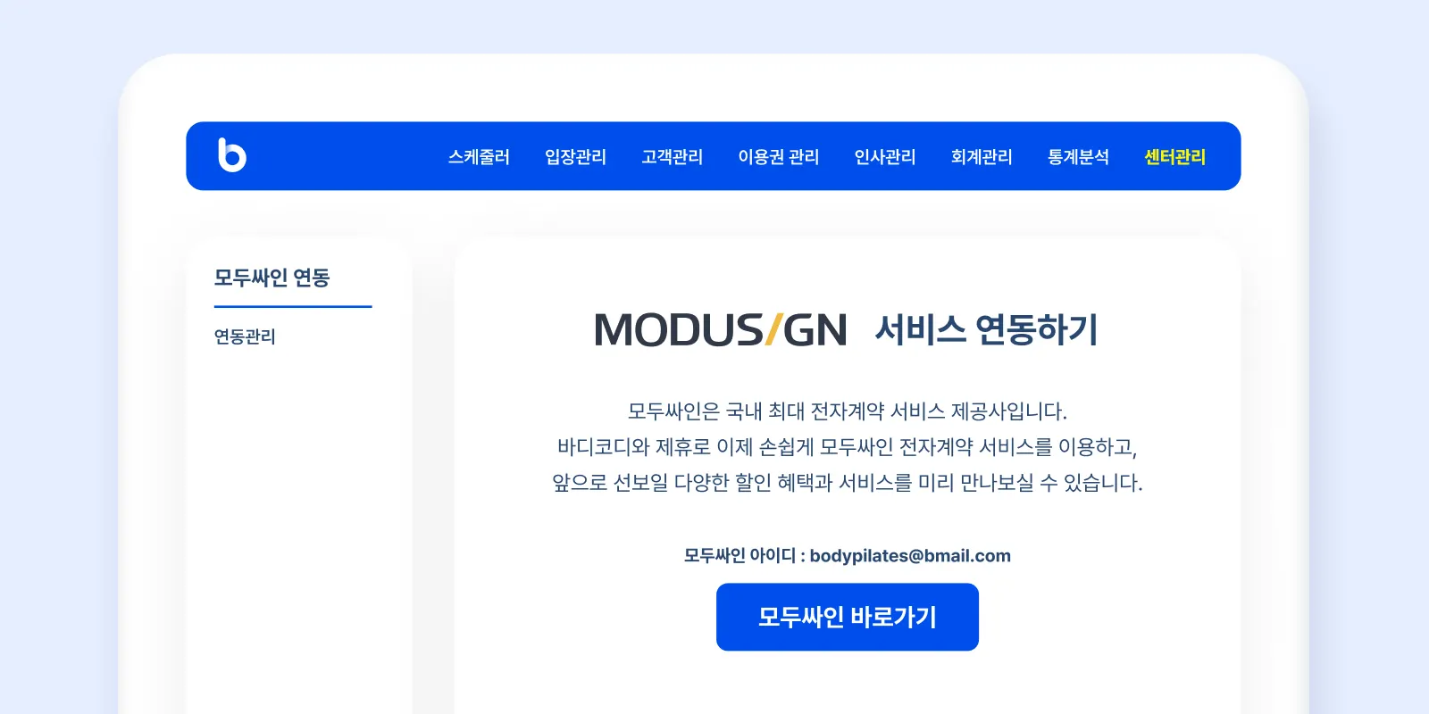 바디코디 센터설정 > 모두싸인 연동 메뉴에서, 이미 연동하기를 마친 사용자들은, “모두싸인 바로가기"를 할 수 있습니다. 모두싸인에서 연동된 계정으로 로그인하면, 문서 발송 내역과 상태를 알 수 있습니다.