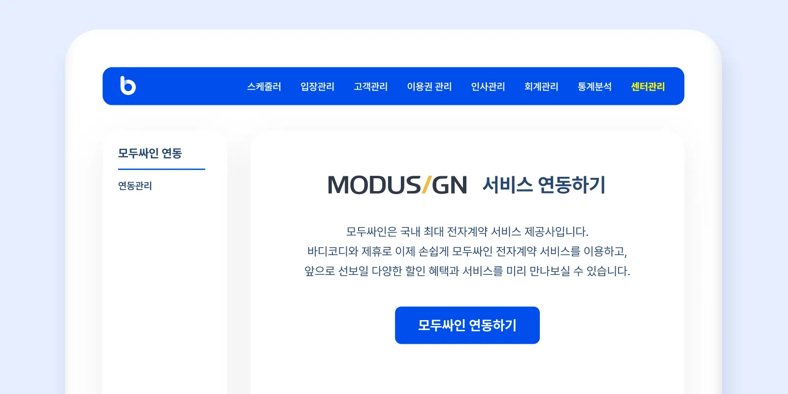 모두싸인은 최초 1회 서비스 연동이 필요합니다. 한번만 연동하면, 바디코디 에서 회원에게 전자계약서를 회원님들의 카카오톡으로 발송할 수 있습니다. 센터관리 > 모두싸인 연동 에서 모두싸인 연동 하기를 클릭하면 됩니다.