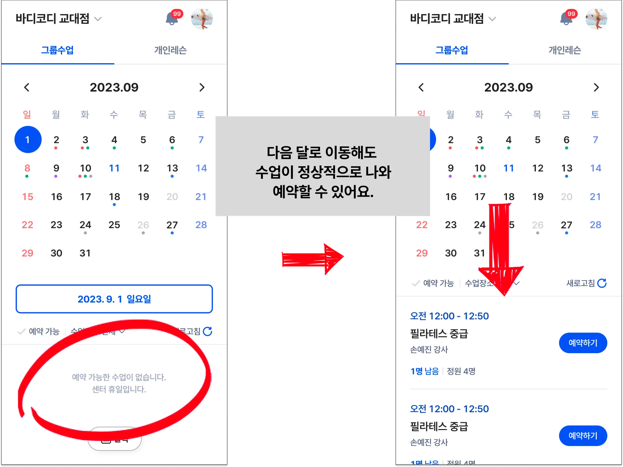 회원앱에서 다음 달 수업을 예약하기 위해 다음 달로 이동했을 때 예약 가능한 수업이 나오지 않는 현상을 발견했어요.