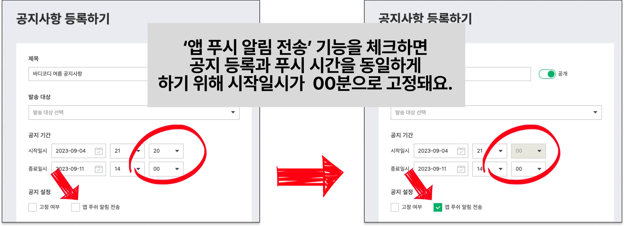 공지사항을 앱 푸쉬 알림 전송을 선택하면, 공지 기간의 시작일시를 00분으로 고정하여 회원앱에 공지가 등록되는 시간과 앱 푸쉬 알림이 전송되는 시간을 동일하게 설정할 수 있도록 개선했어요.