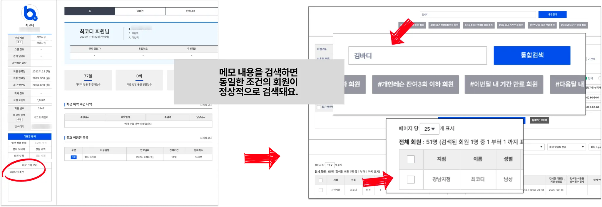 지점통합형 지점 중 지점 메모 내용으로 회원을 검색 시 메모에 등록된 내용으로 검색이 되지 않는 현상을 발견했어요.