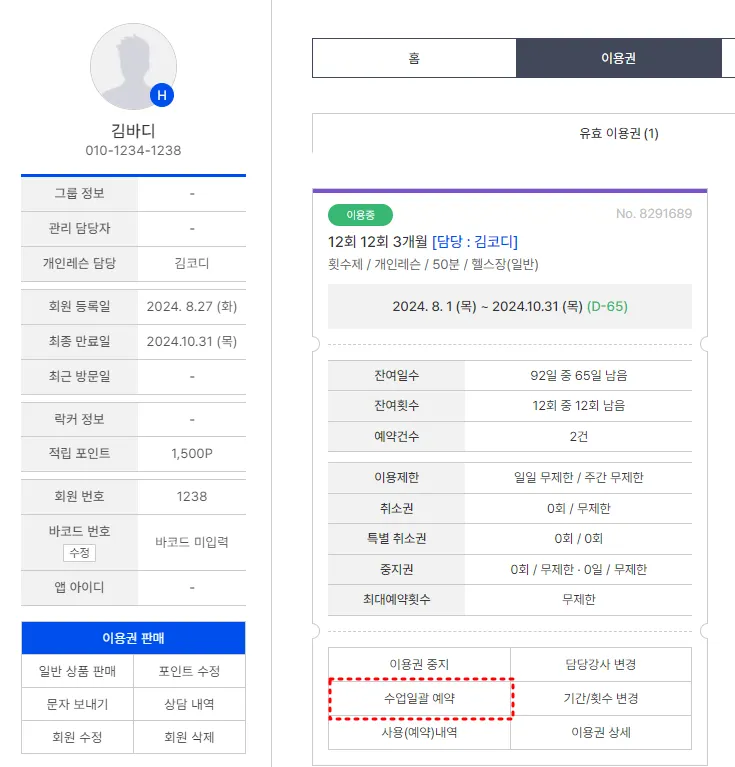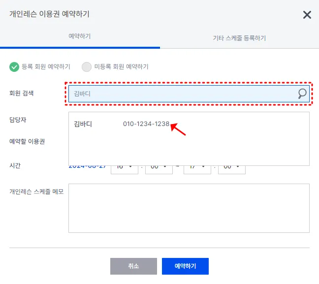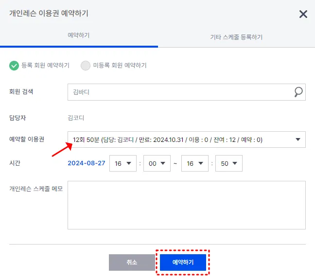 회원 검색 후 > 회원 선택 > 예약할 이용권 확인 후 > 예약하기