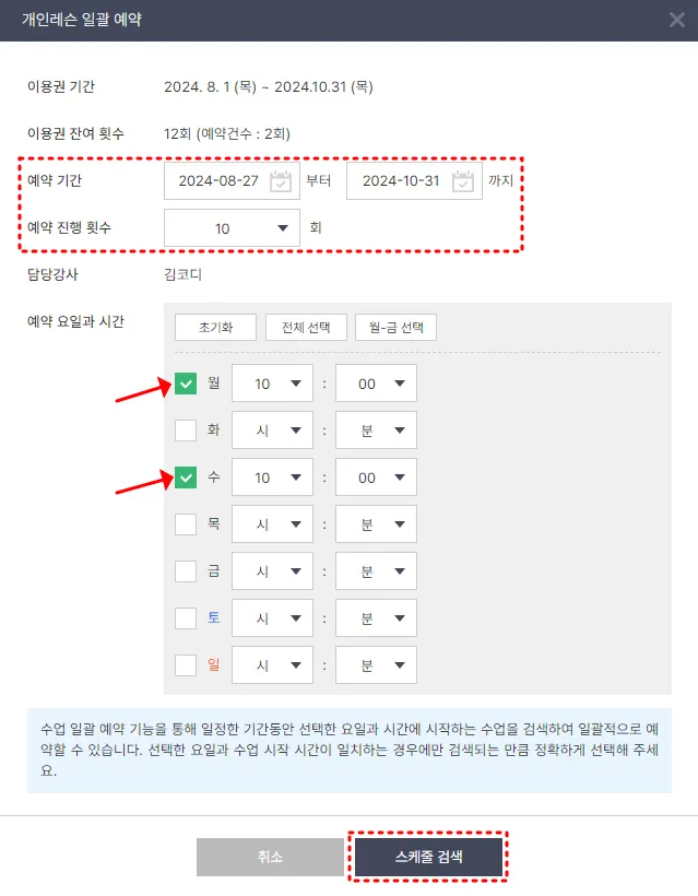 일괄 예약을 원하는 기간 선택, 횟수 선택, 요일과 시간 선택 후 > 스케줄 검색
