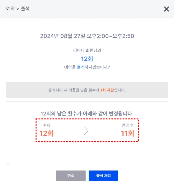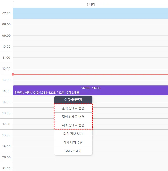 동일한 화면에서 예약 출석/결석/취소 상태로 변경할 수 있어요.