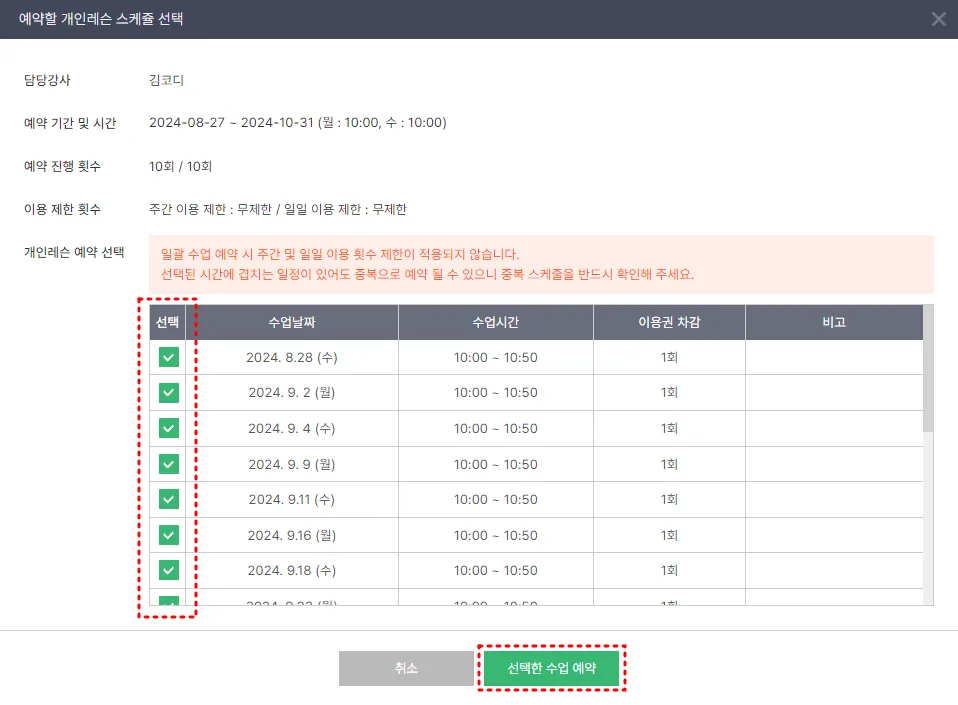 미리 협의되어 스케줄 예약이 필요 없는 날짜는 체크를 풀어, 최종 확인 후에 ‘선택한 수업 예약’을 눌러주세요.