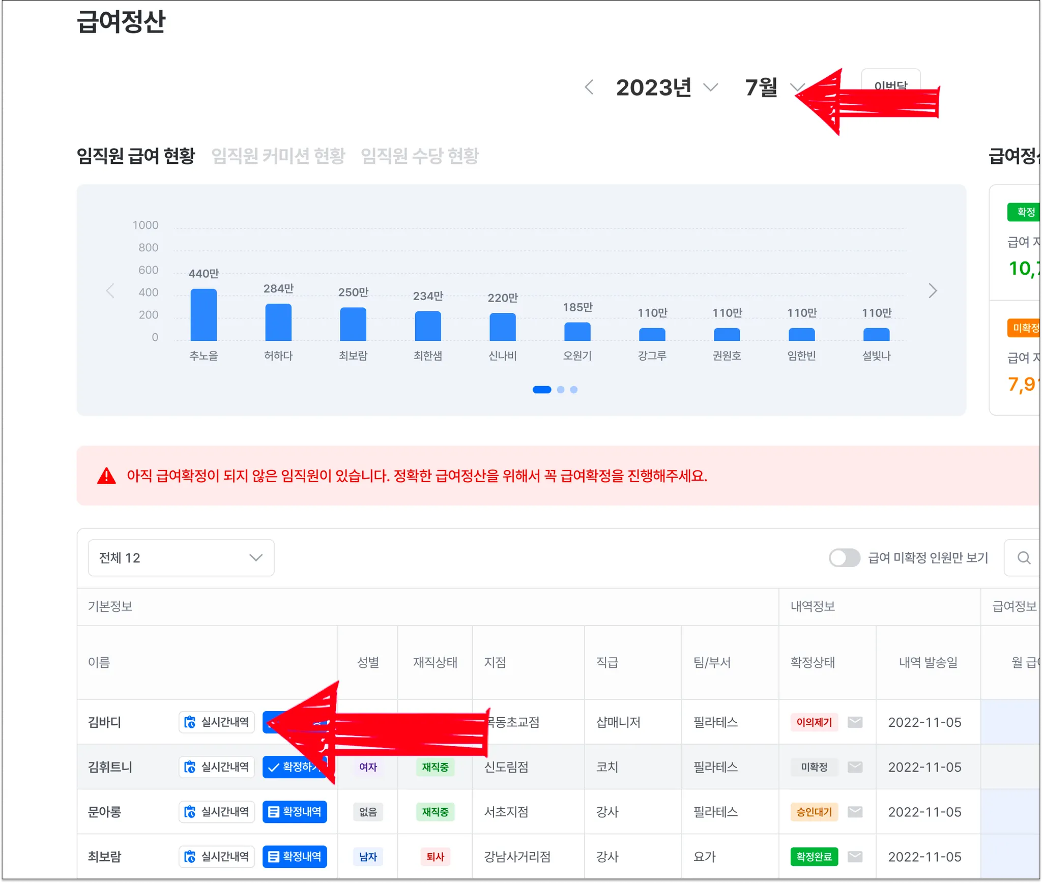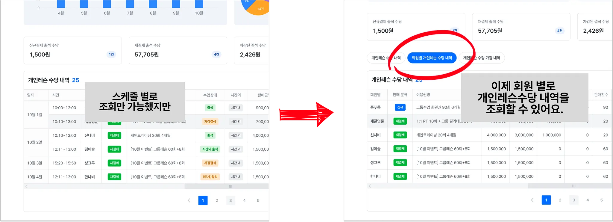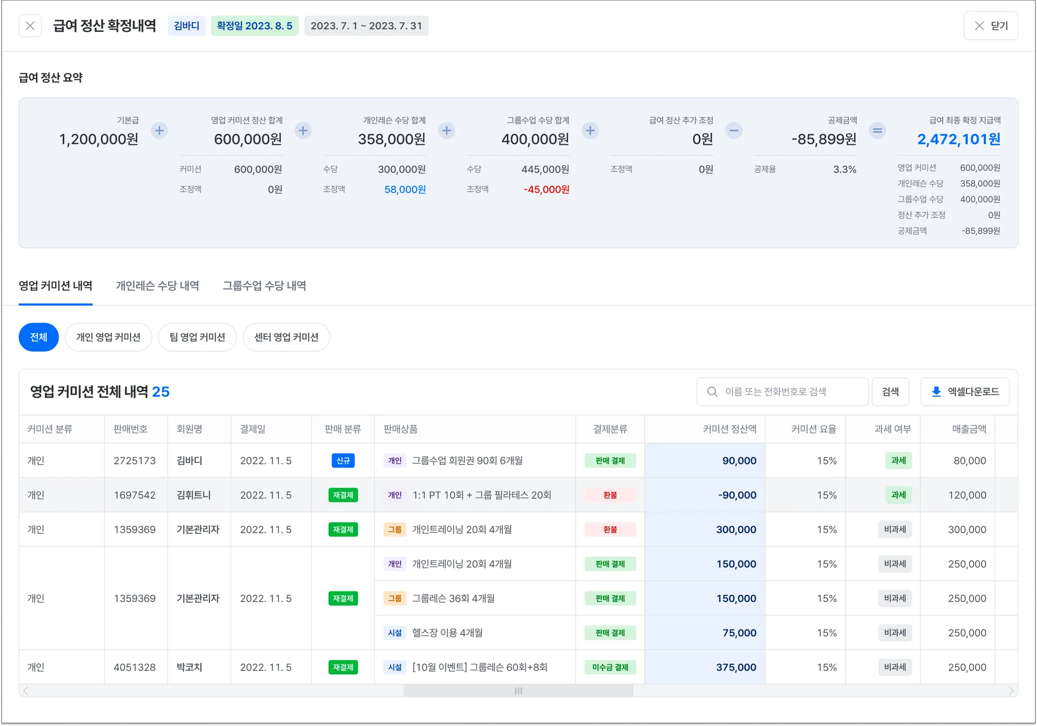 개인레슨 수당은 회원 별로 수당 내역을 확인하는 게 중요해요.