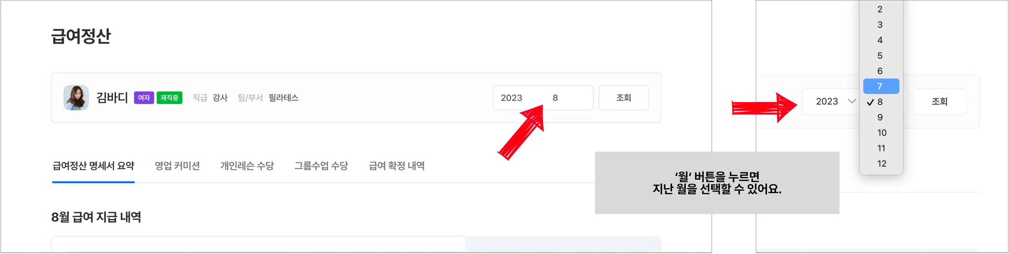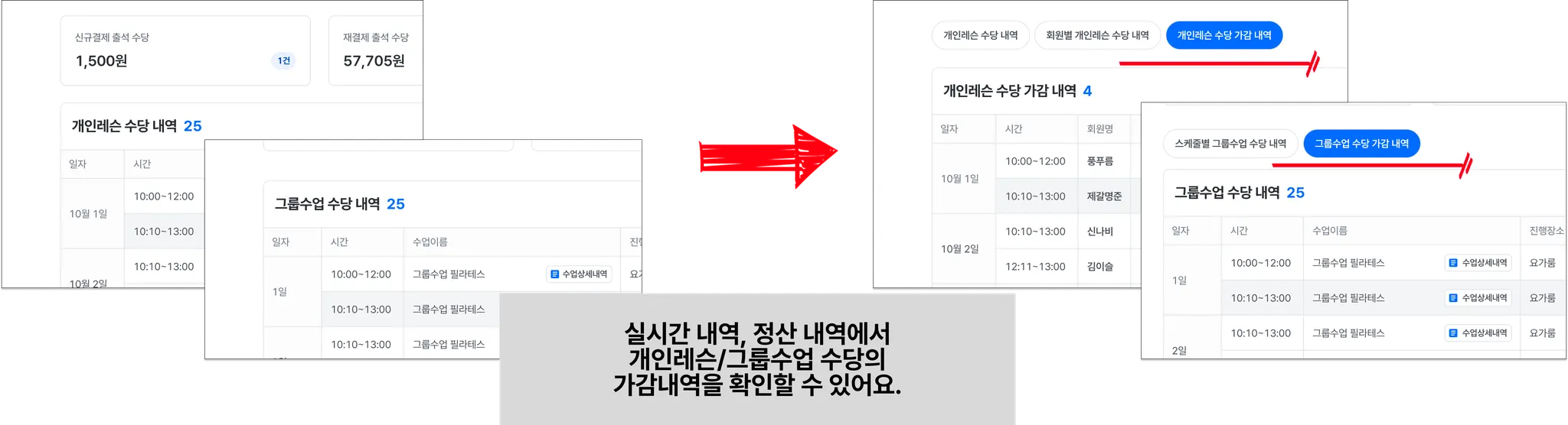 2. 개인레슨 수당, 그룹수업 수당의 가감내역을 확인할 수 있어요.