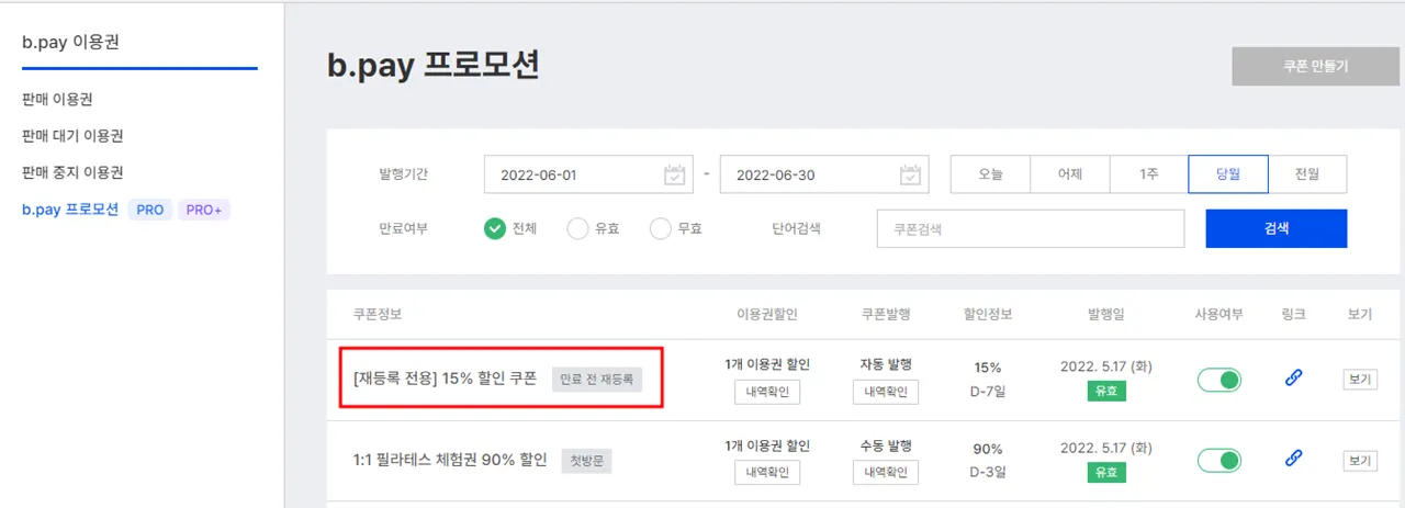 만료 전 재등록 회원 자동 쿠폰 세팅
