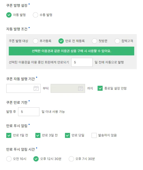 쿠폰 자동 발행 기간 설정-‘종료일 설정 안함’ 추천