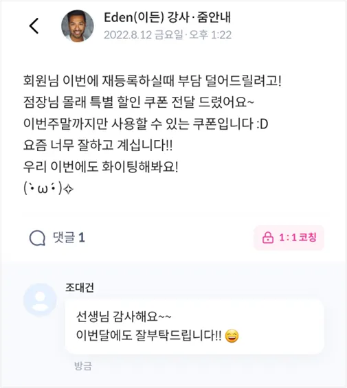 회원과 앱을 통해 라포 형성(친밀감)을 하는 게 중요해요!