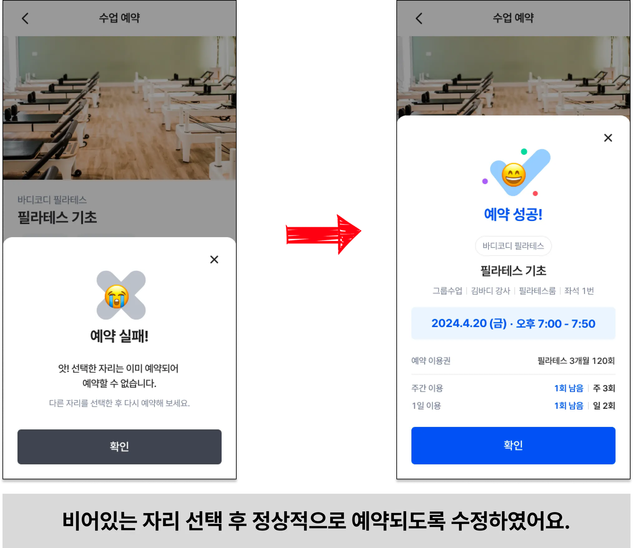 그룹수업에 빈 자리를 선택 후 예약을 시도했을 때 이미 예약된 좌석이라고 표시되며, 예약이 되지 않는 현상을 발견했어요.