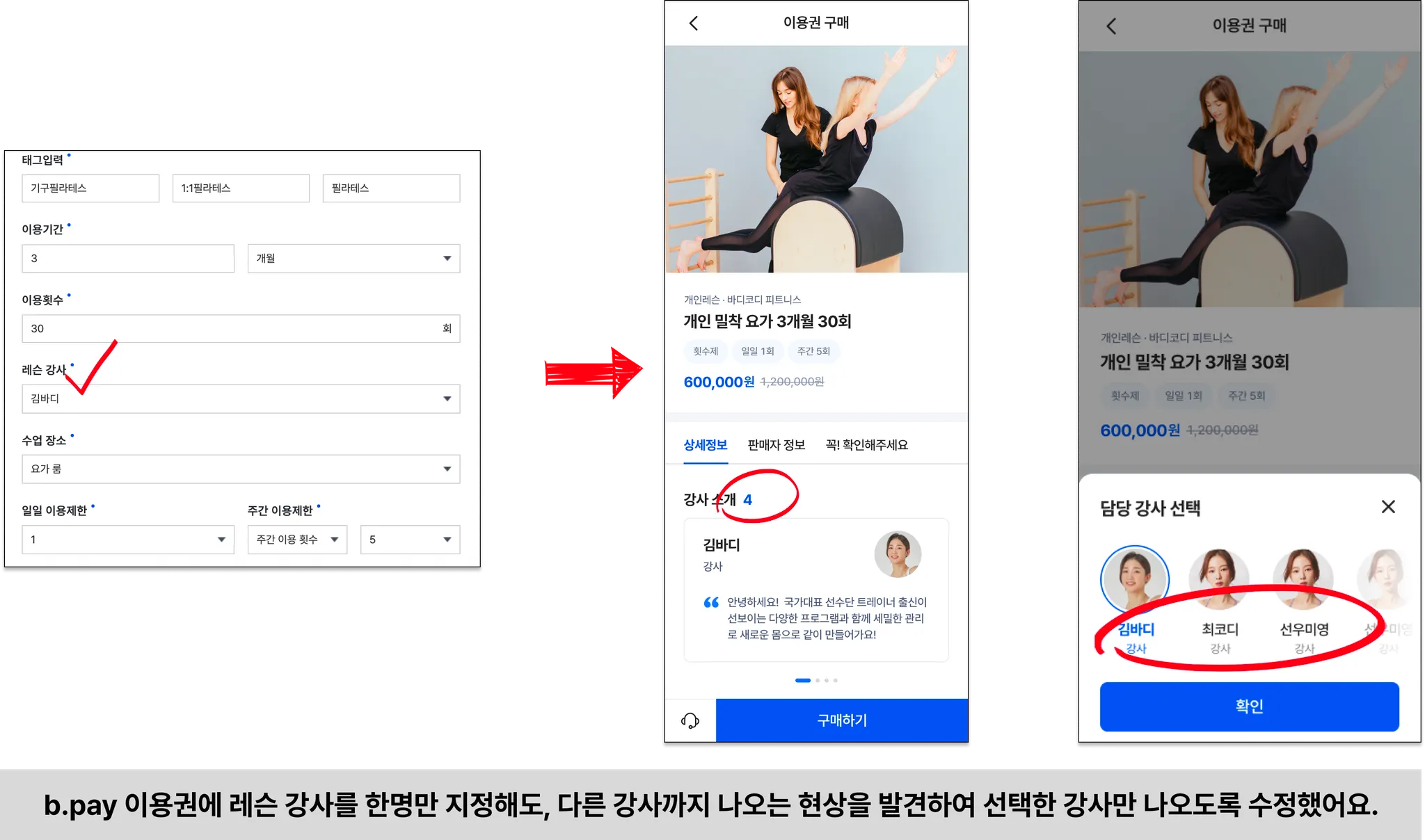 레슨 강사를 선택하면, 회원이 앱에서 구매할 때 선택한 강사만 담당강사로 선택할 수 있어요.