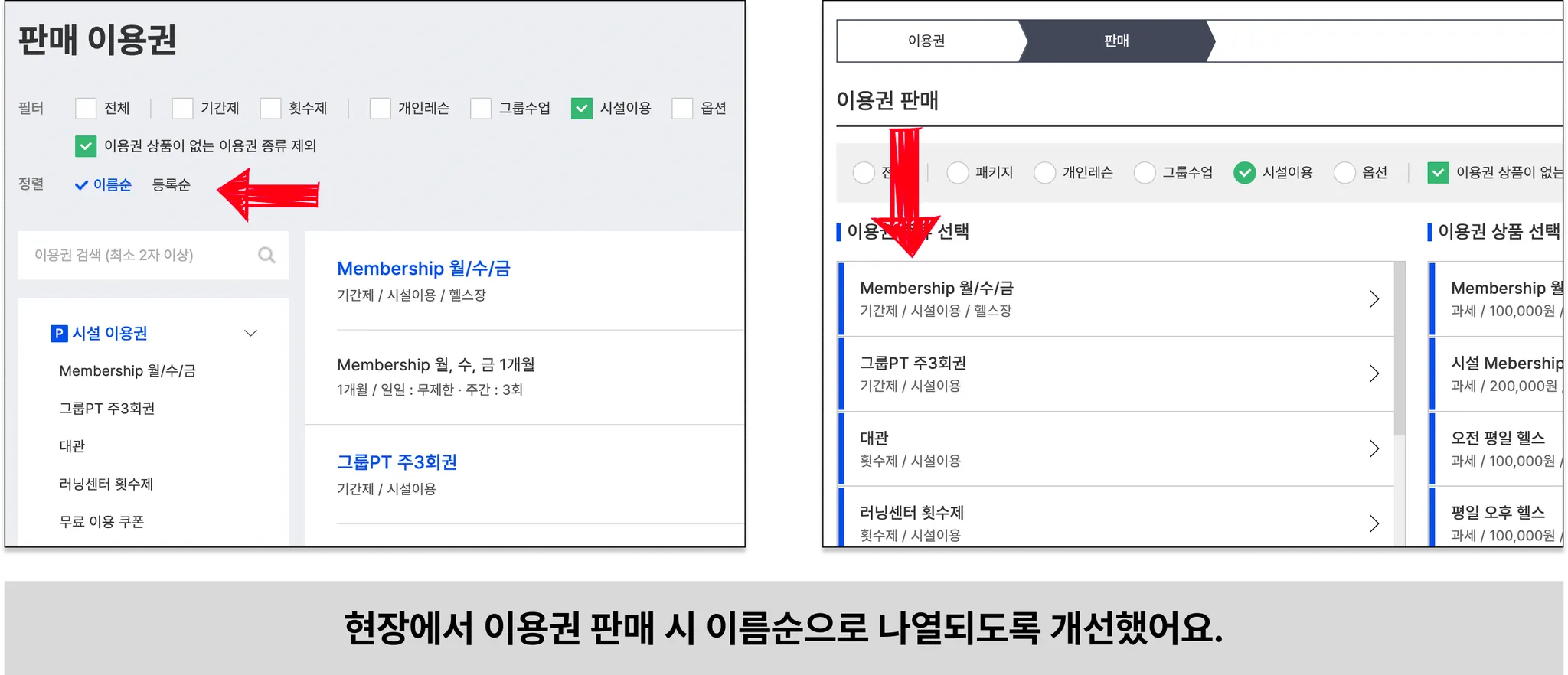하지만 현장 판매 시 정렬이 되지 않아, 다른 이용권으로 판매하는 실수가 생기는 등 불편사항이 생겨 이를 개선하기 위해, 이용권 판매 시에도 이름 순서로 정렬되도록 수정했어요.