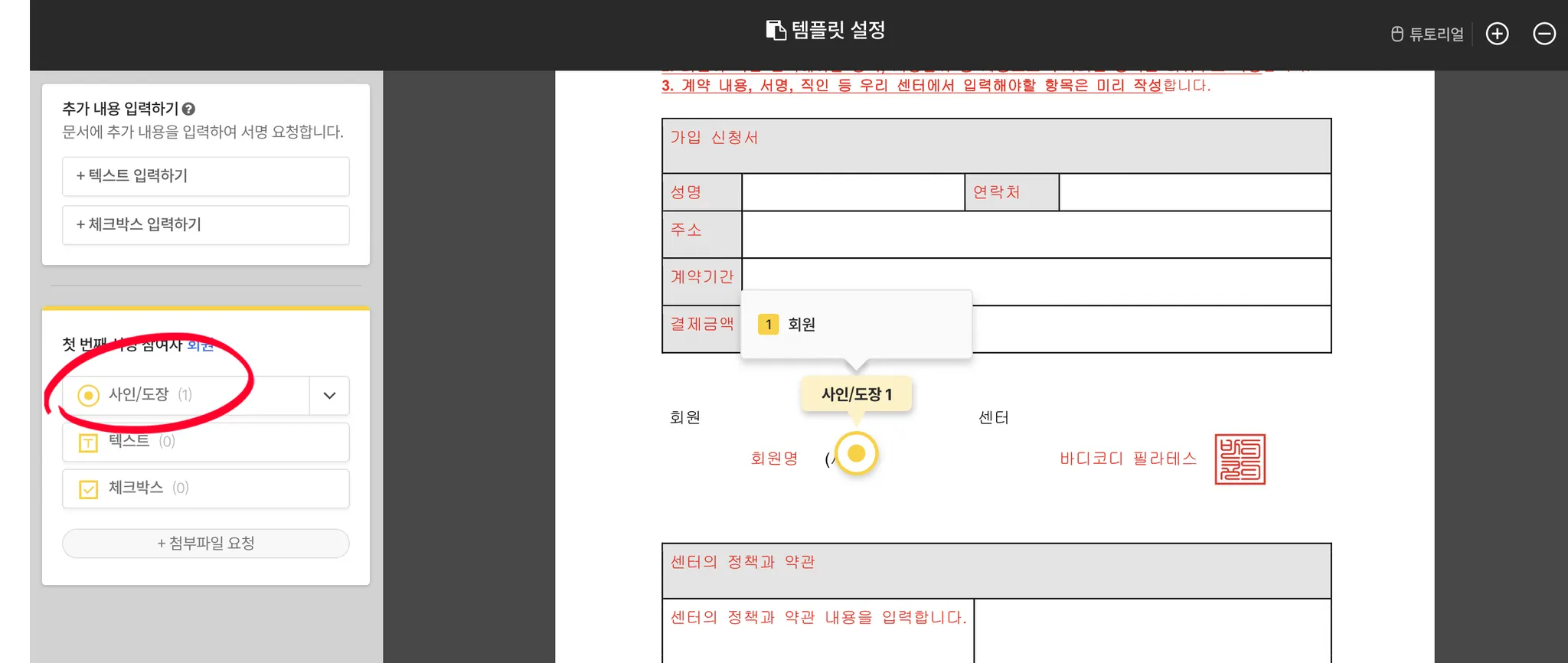 왼쪽에 사인/도장을 누르면 회원이 서명할 위치를 설정할 수 있습니다.