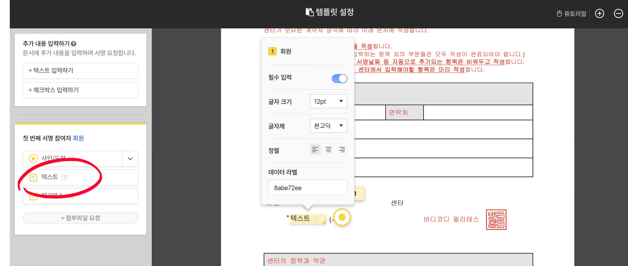 템플릿 등록 시 서명자는 “회원”만 가능합니다. 발신자가 서명할 수 없으니 센터명, 직인 등 미리 작성할 수 있는 요소들은 모두 작성 후 템플릿으로 등록해야 합니다.