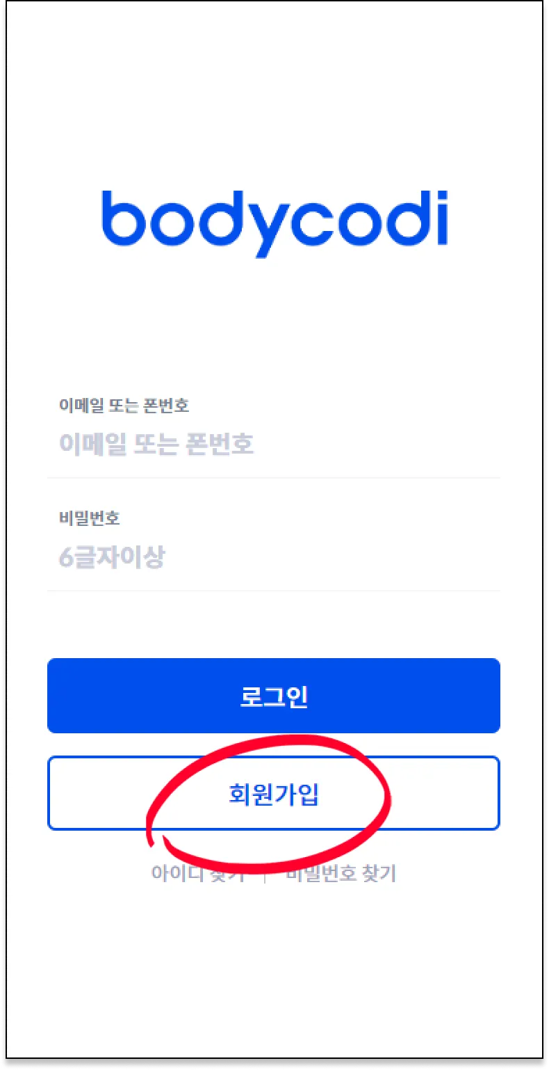 바디코디 회원앱을 이용하기 전, 회원가입을 해야 이용이 가능합니다.
