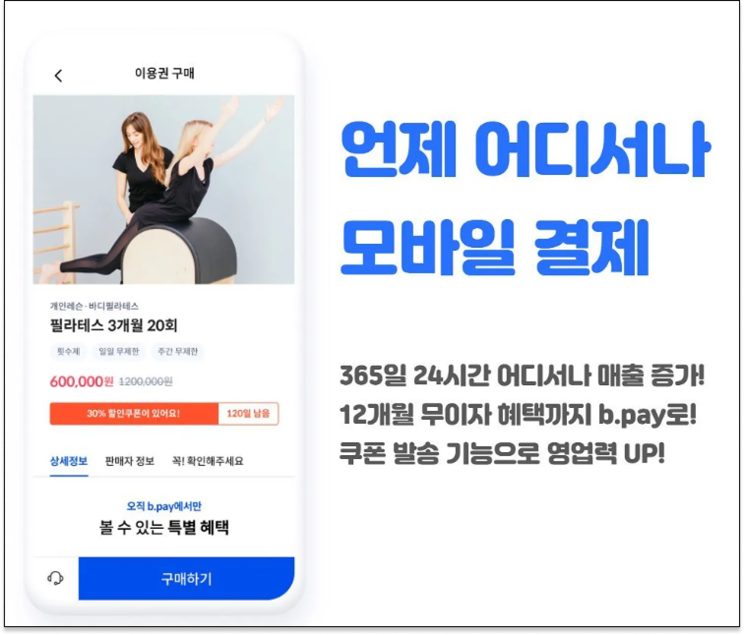 추가적인 할인 쿠폰 전송이나 커뮤니티로 좋은 정보를 전달하고 “집에 가서도! 365일 24시간” 결제받을 수 있어요!