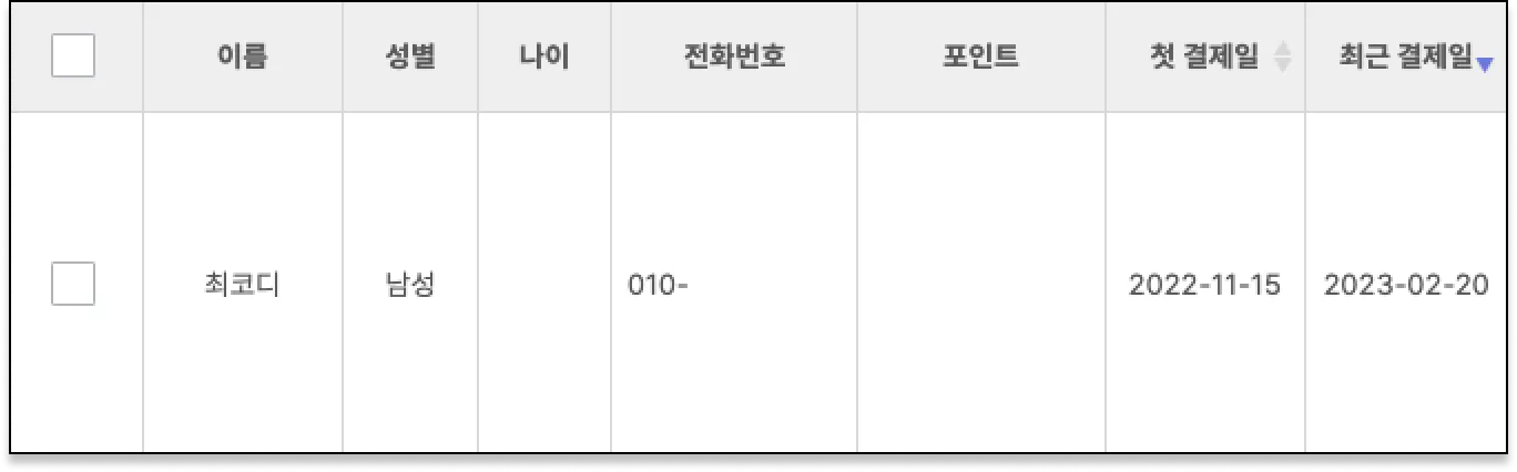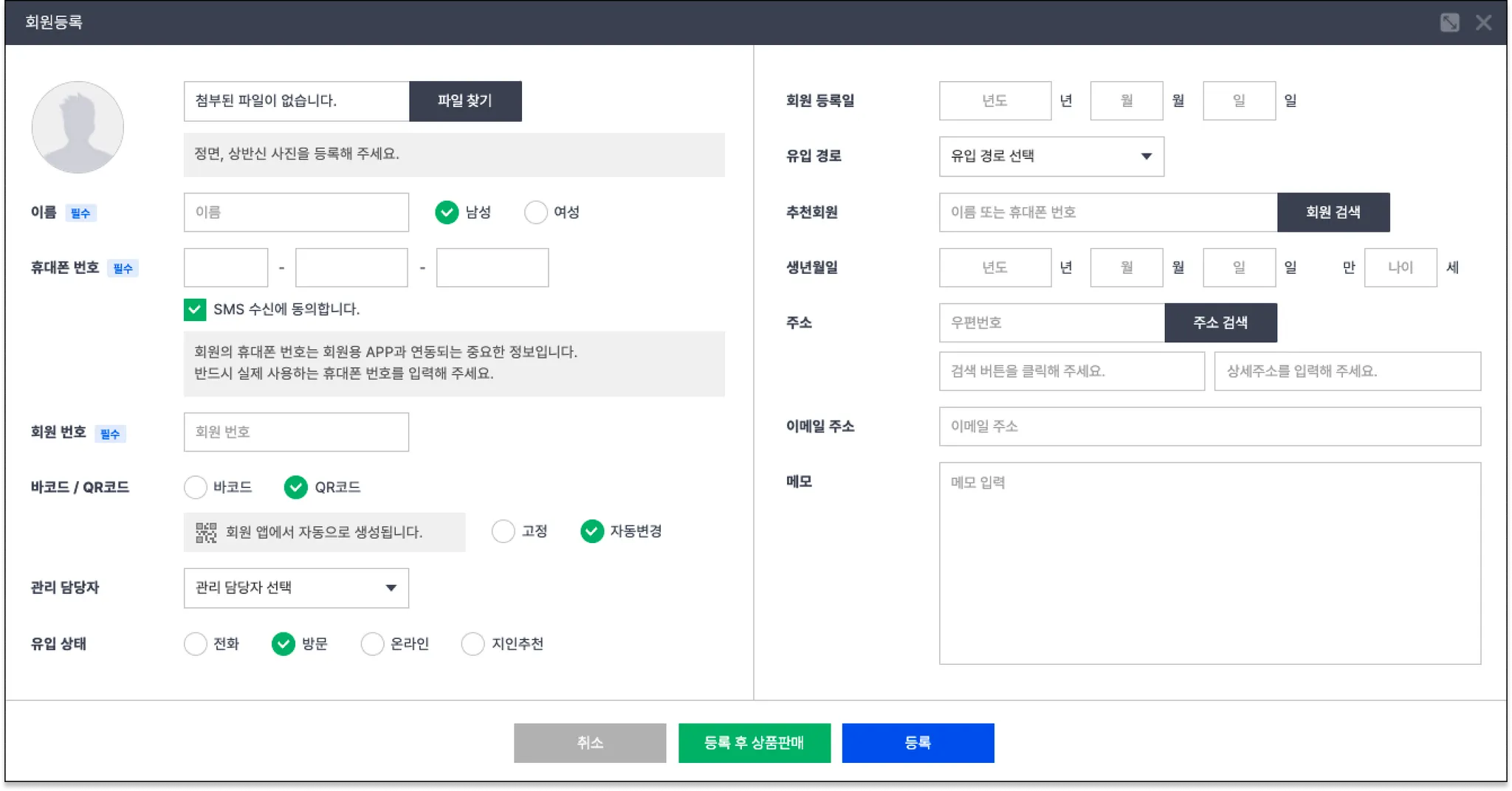 여기서 입력한 회원정보는 고객관리 > 회원 검색 > 회원 선택 > 회원 상세페이지 > 회원 수정에서 확인 가능합니다.