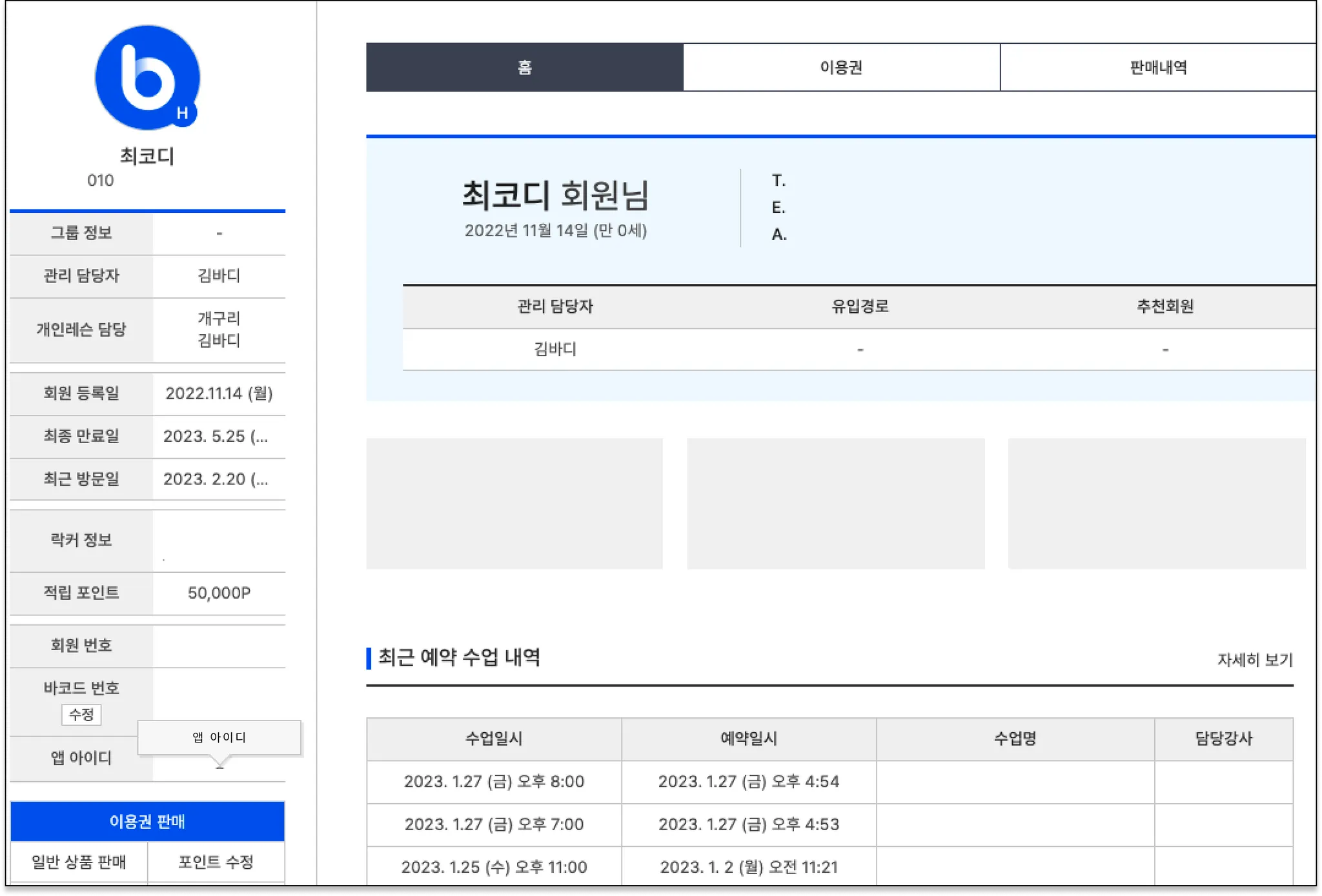 A) 회원 상세페이지 좌측 앱아이디에 아이디가 있다면, 회원님께서 회원앱을 설치한 후 회원가입하셨다는 뜻입니다.