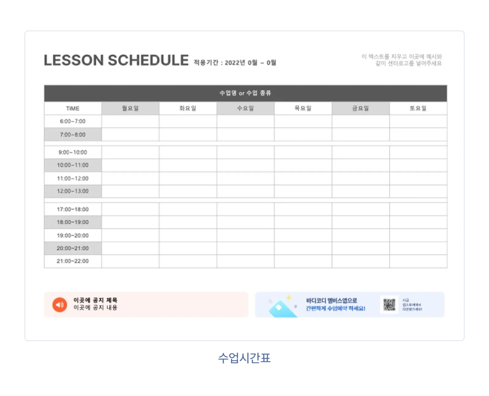 피트니스&필라테스&헬스&골프&요가 등 다용도로 사용할 수 있는 수업 시간표 샘플입니다.