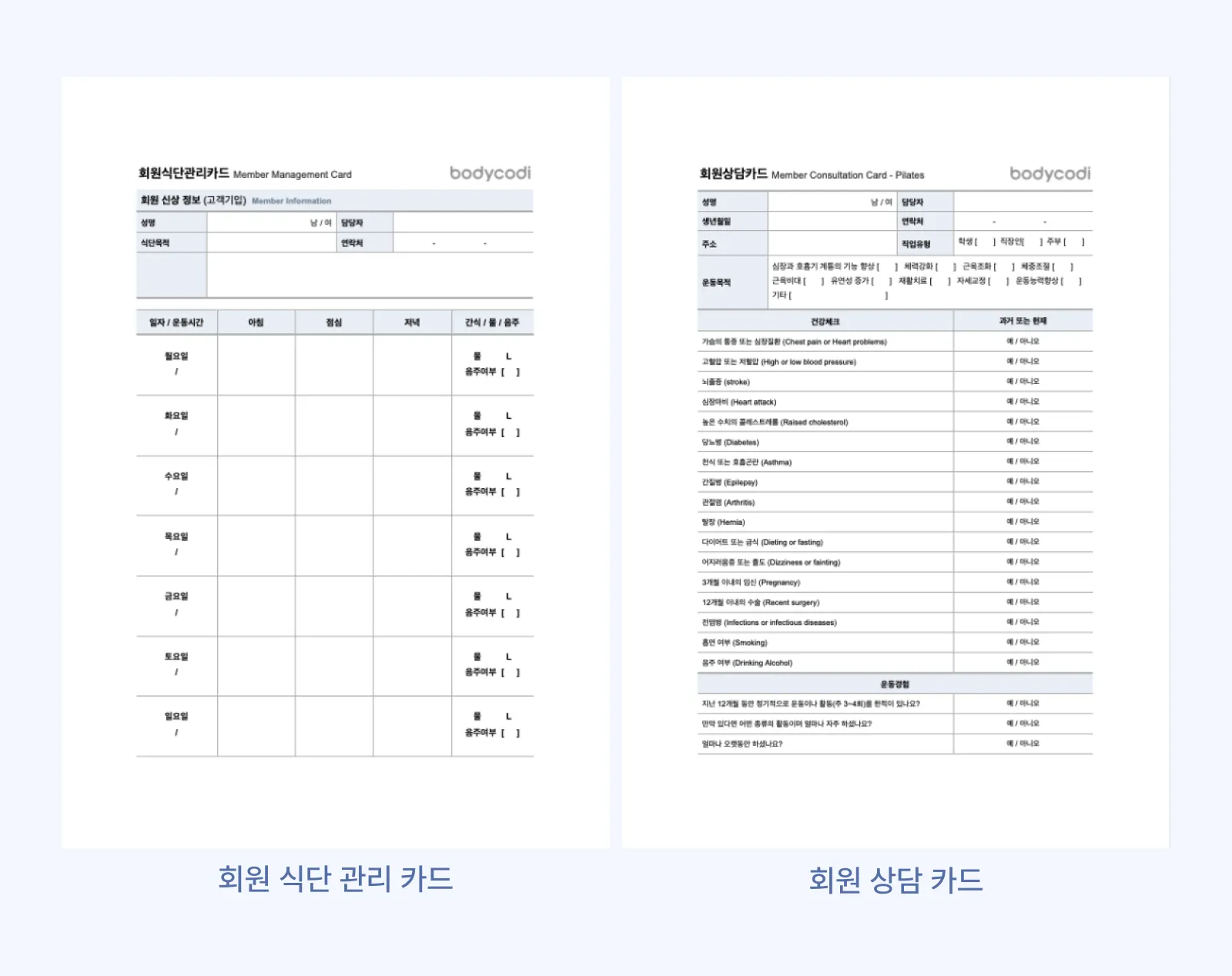 피트니스&필라테스&헬스&골프&요가 등 다용도로 사용할 수 있는 회원 식단관리카드와 회원 상담카드 샘플입니다.