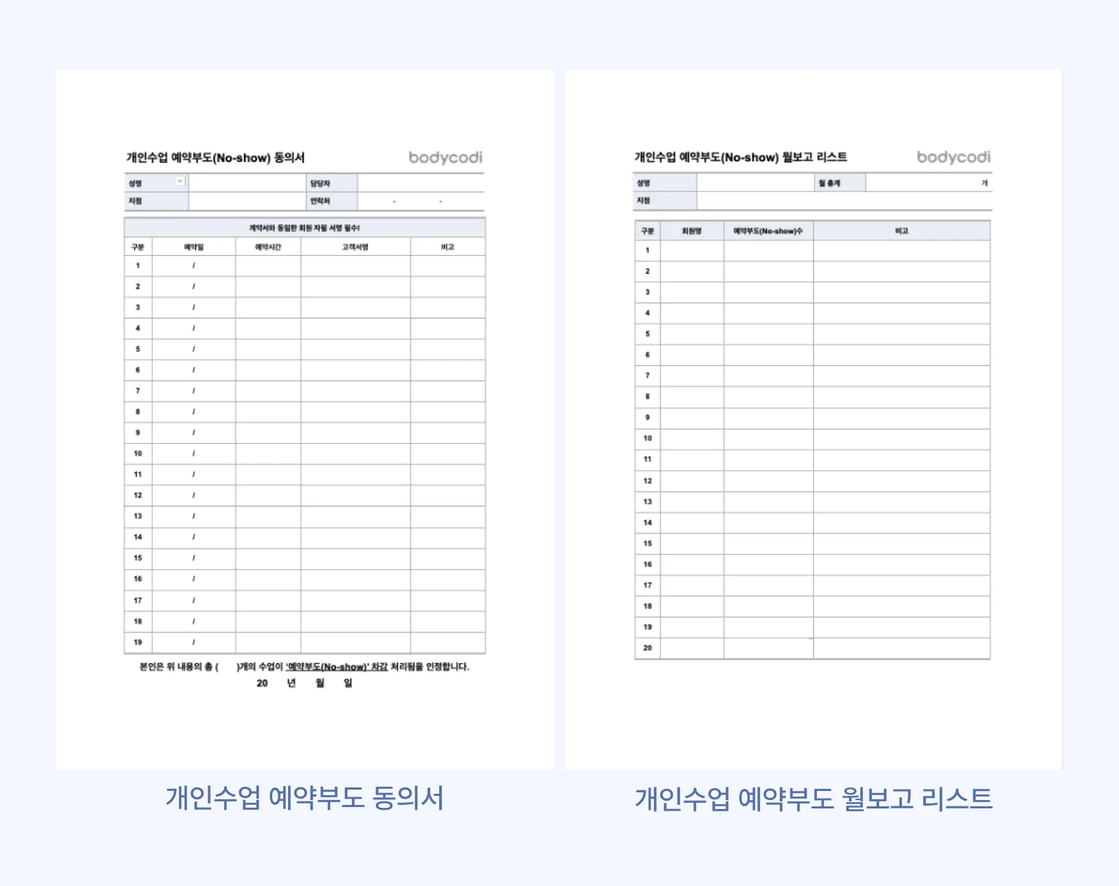 피트니스&필라테스&헬스&골프&요가 등 다용도로 사용할 수 있는 개인수업 예약부도(No-Show) 동의서 및 월보고 리스트 샘플입니다.