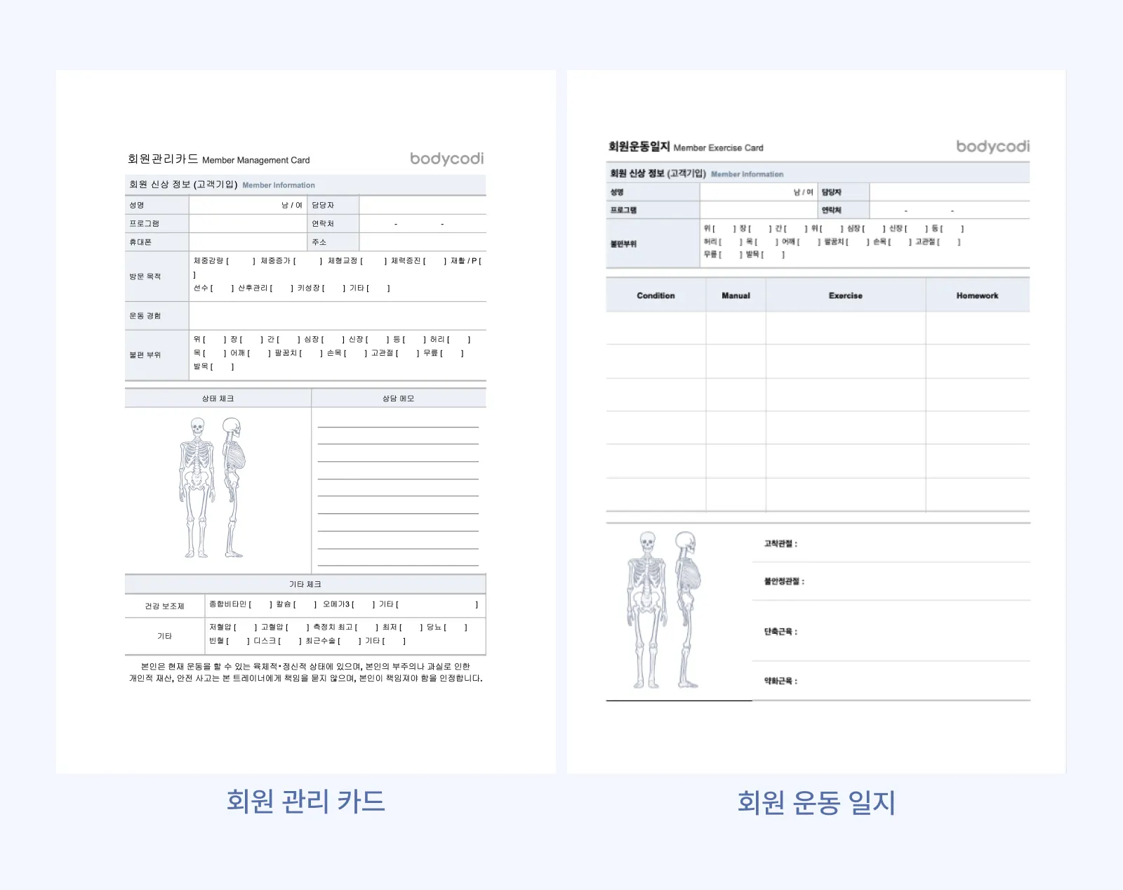 피트니스&필라테스&헬스&골프&요가 등 다용도로 사용할 수 있는 회원관리카드와 회원운동일지 샘플입니다.